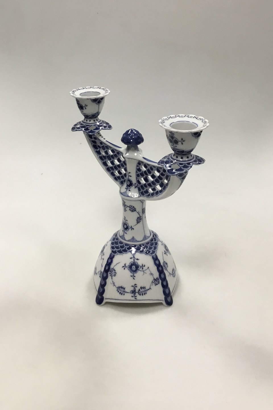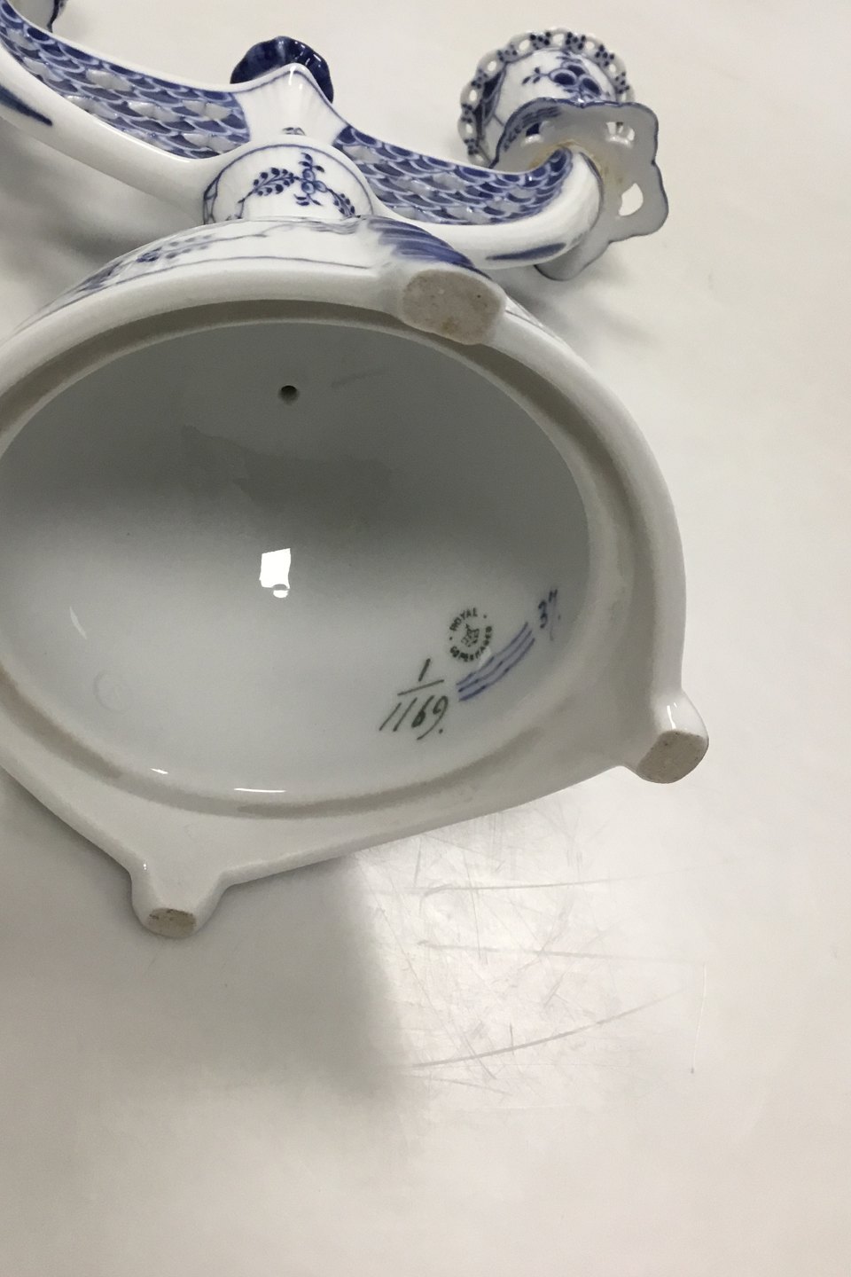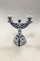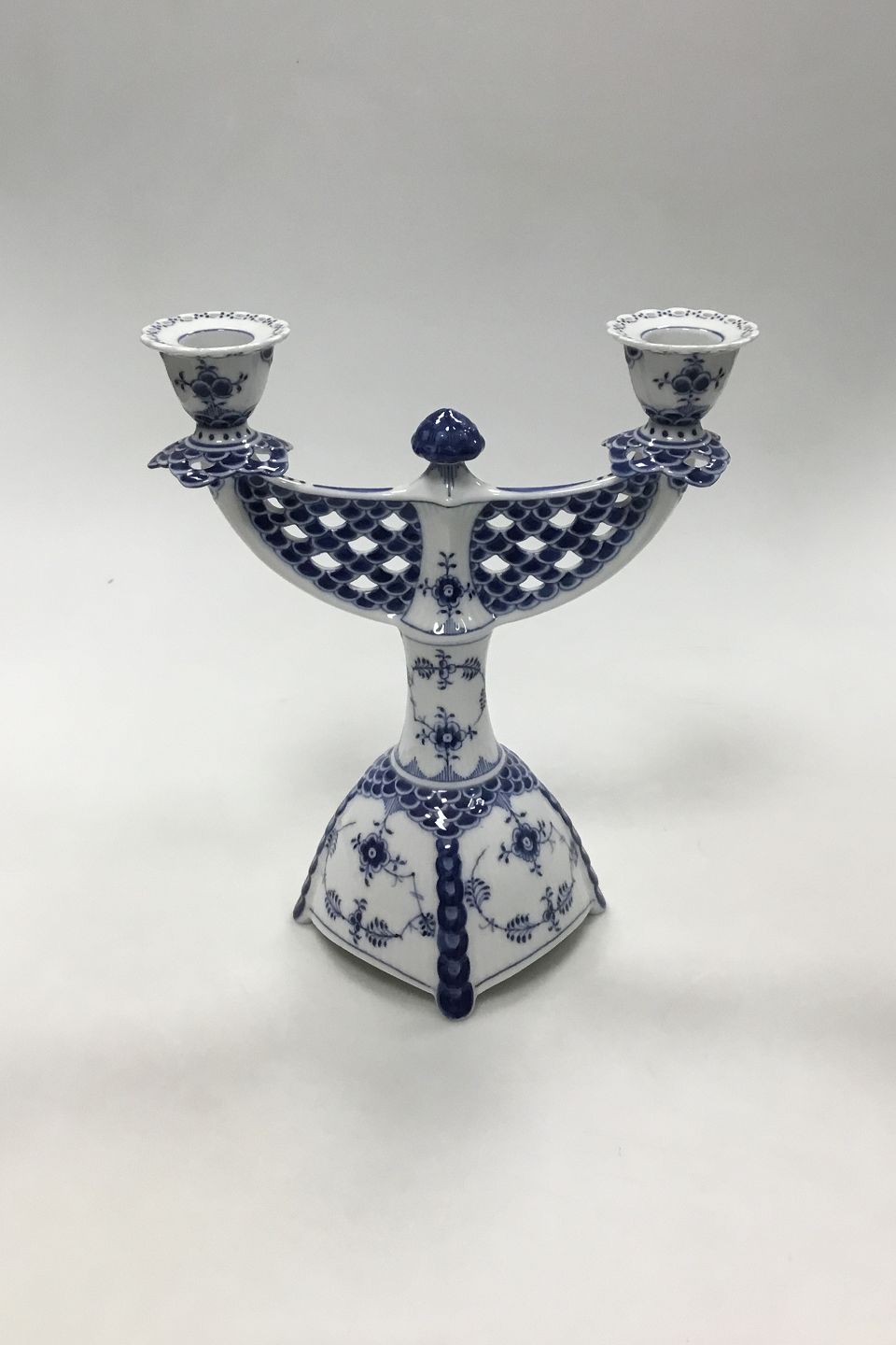 Royal Copenhagen Blue Fluted Full Lace Two-Armed Candelabra No 1169. Measures 24 cm (9.45 in). 1st Quality with chipping on one light holder.