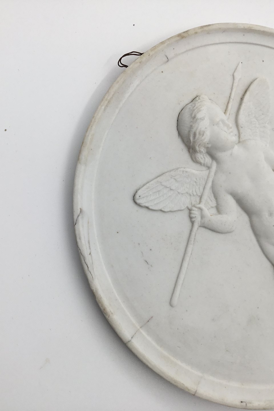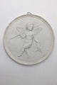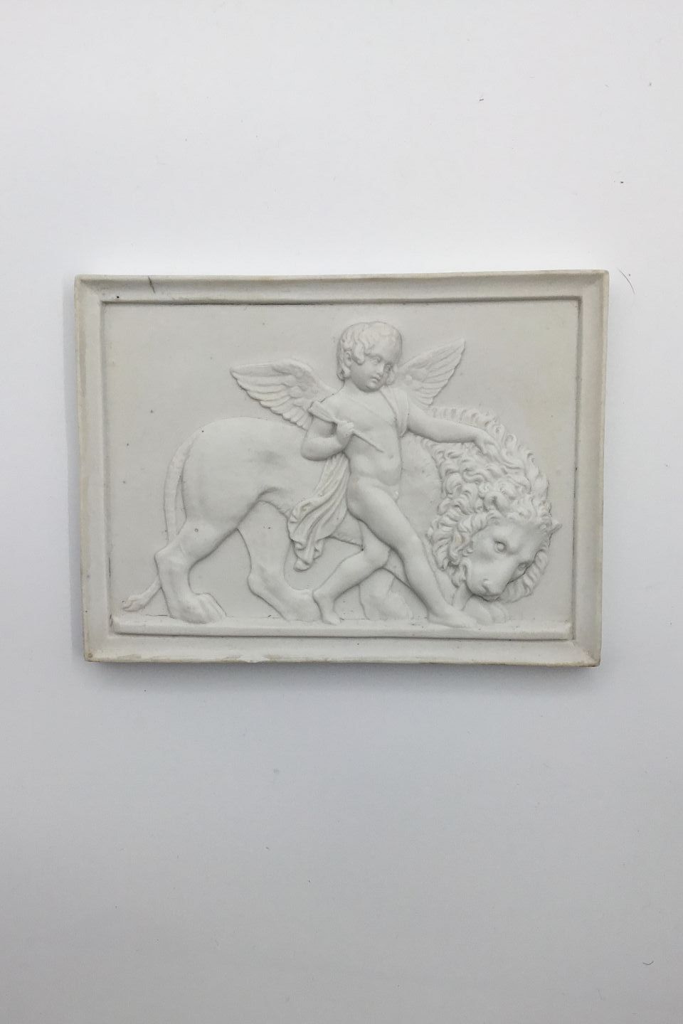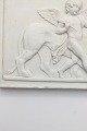 Bing & Grøndahl bisquit platte af Bertel Thorvaldsen Amor med den tæmmede løve nr. 76. Kopi efter originalen produceret i Rom 1828. 10 x 13,5cm. Mindre skår på kanten nederst.