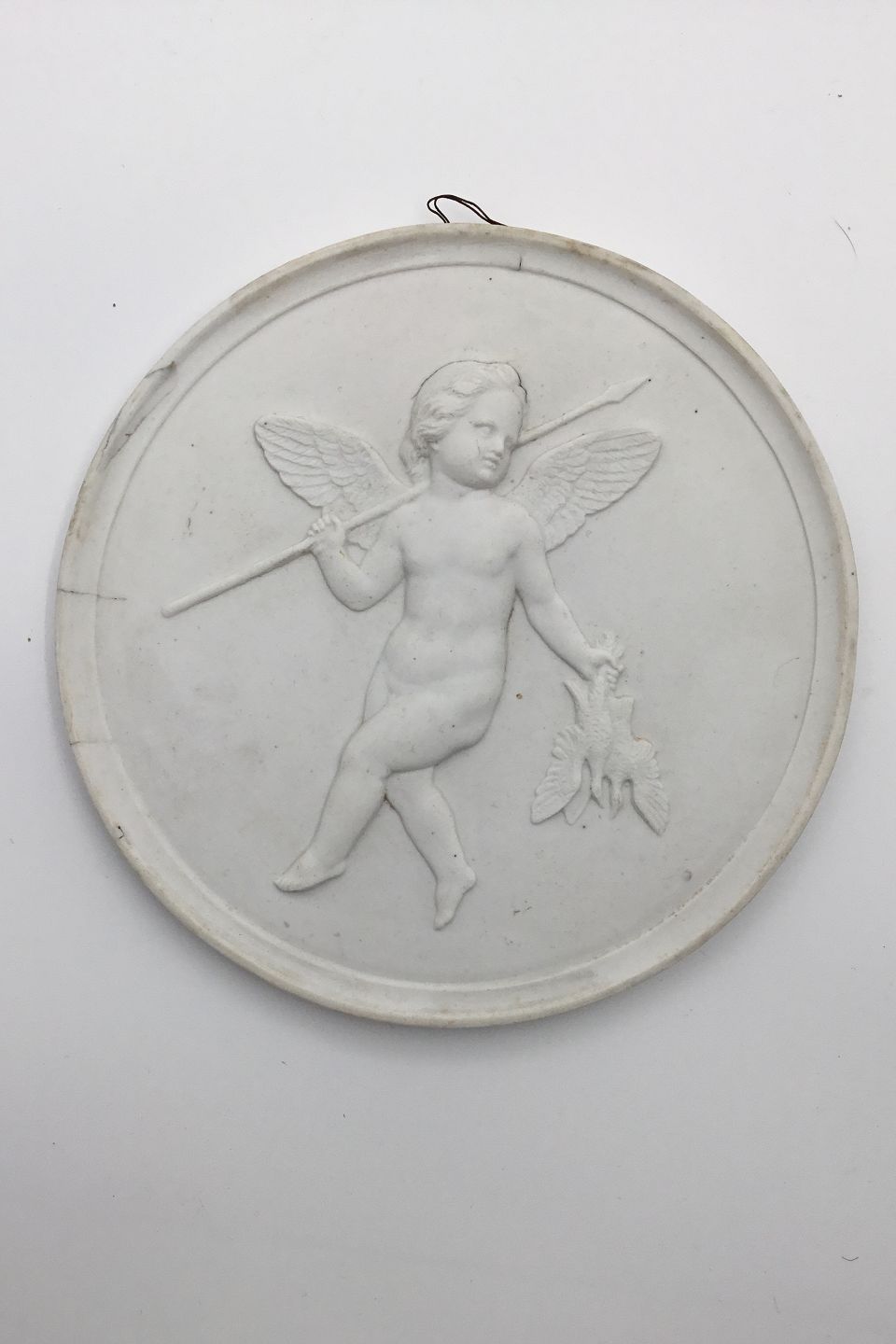 Bing & Grøndahl bisquit platte: "Jagtens Genius". Efter relief modelleret i Rom 1838 af Pietro Galli efter tegning af Bertel Thorvaldsen. Måler: 14cm