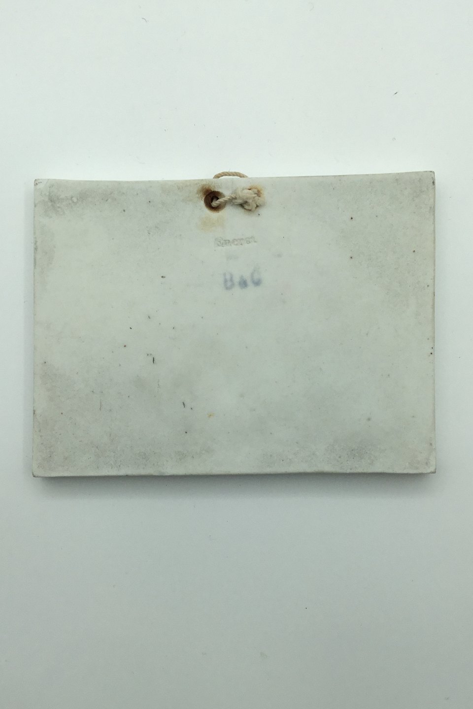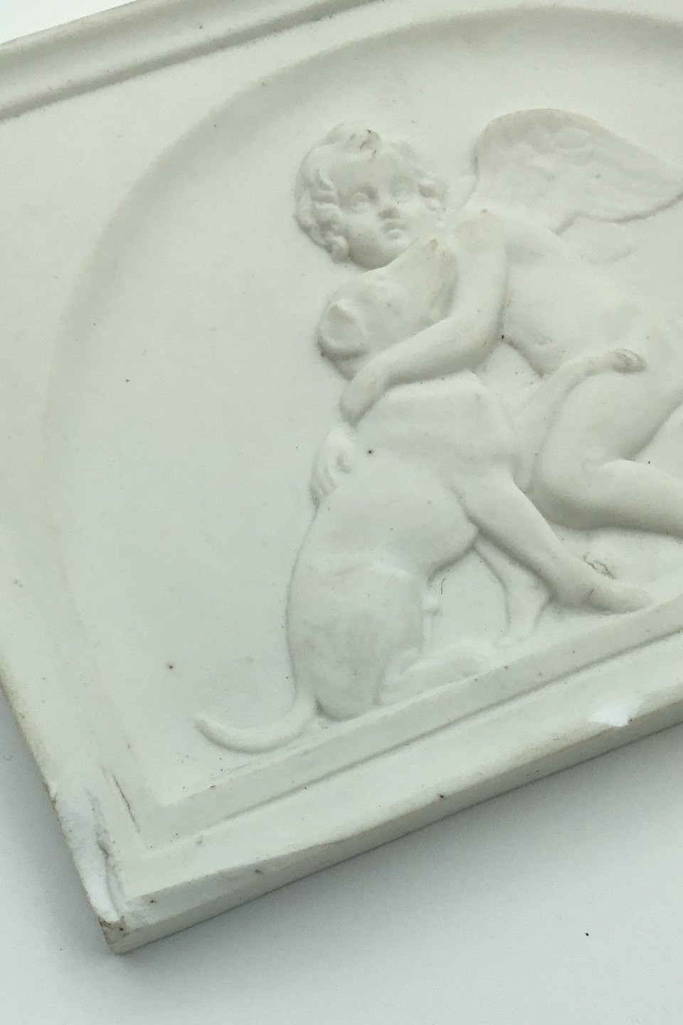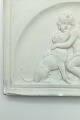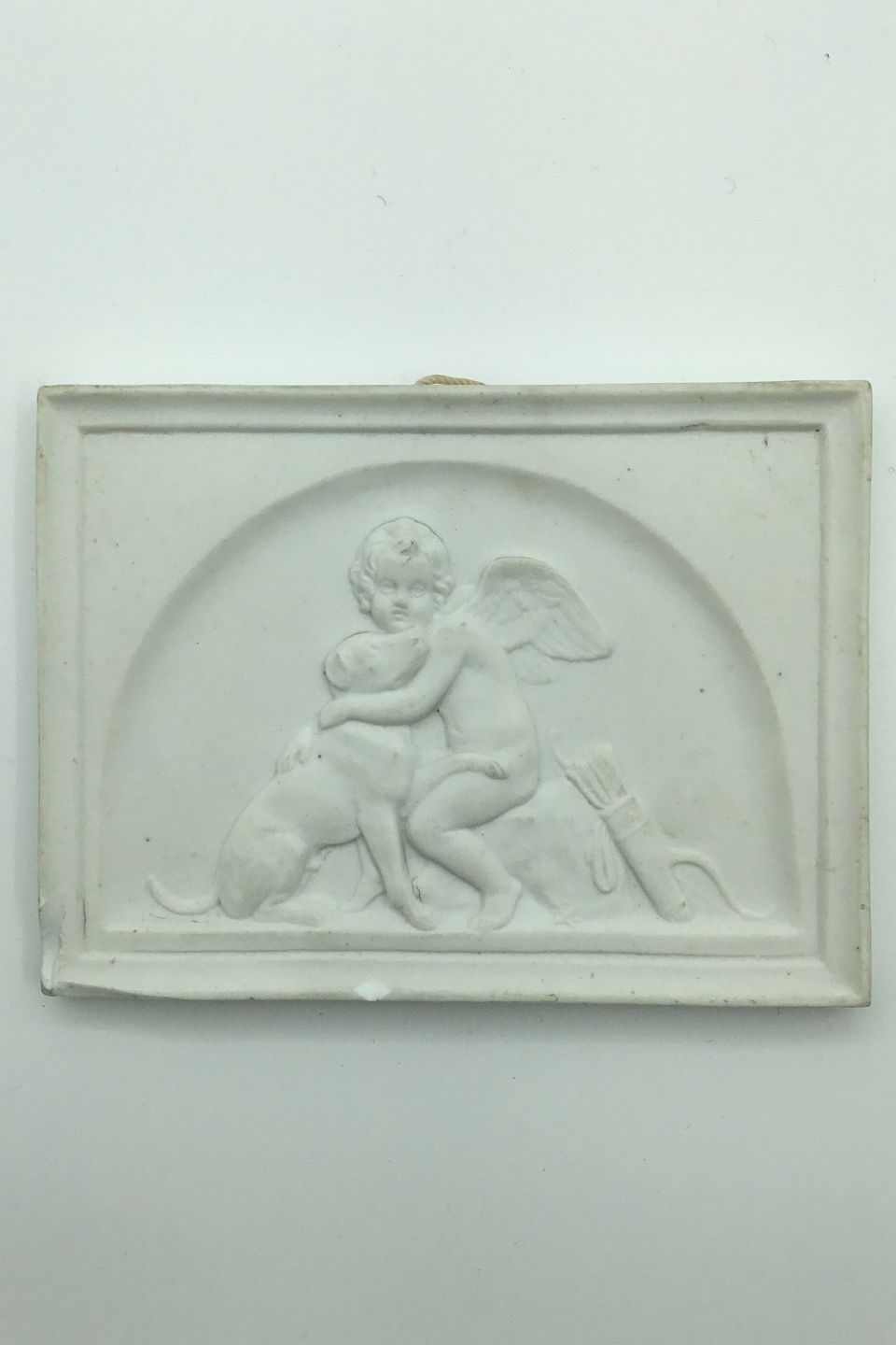 Bing & Grøndahl Biscuit Platte "Amor kærtegner den tro hund" No 72. Kopi fra 1855 after Thorvaldsens original fra Rom 1831. Måler 13 x 9,5cm (5.11 x 74 inch).