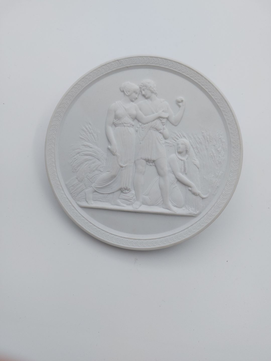 Bertel Thorvaldsen: Royal Copenhagen bisquit platte "Ungdom og forår" Efter relief modelleret i Rom 1836. Måler 13.5cm (5.31 inch). Fremstillet i 20. århundrede