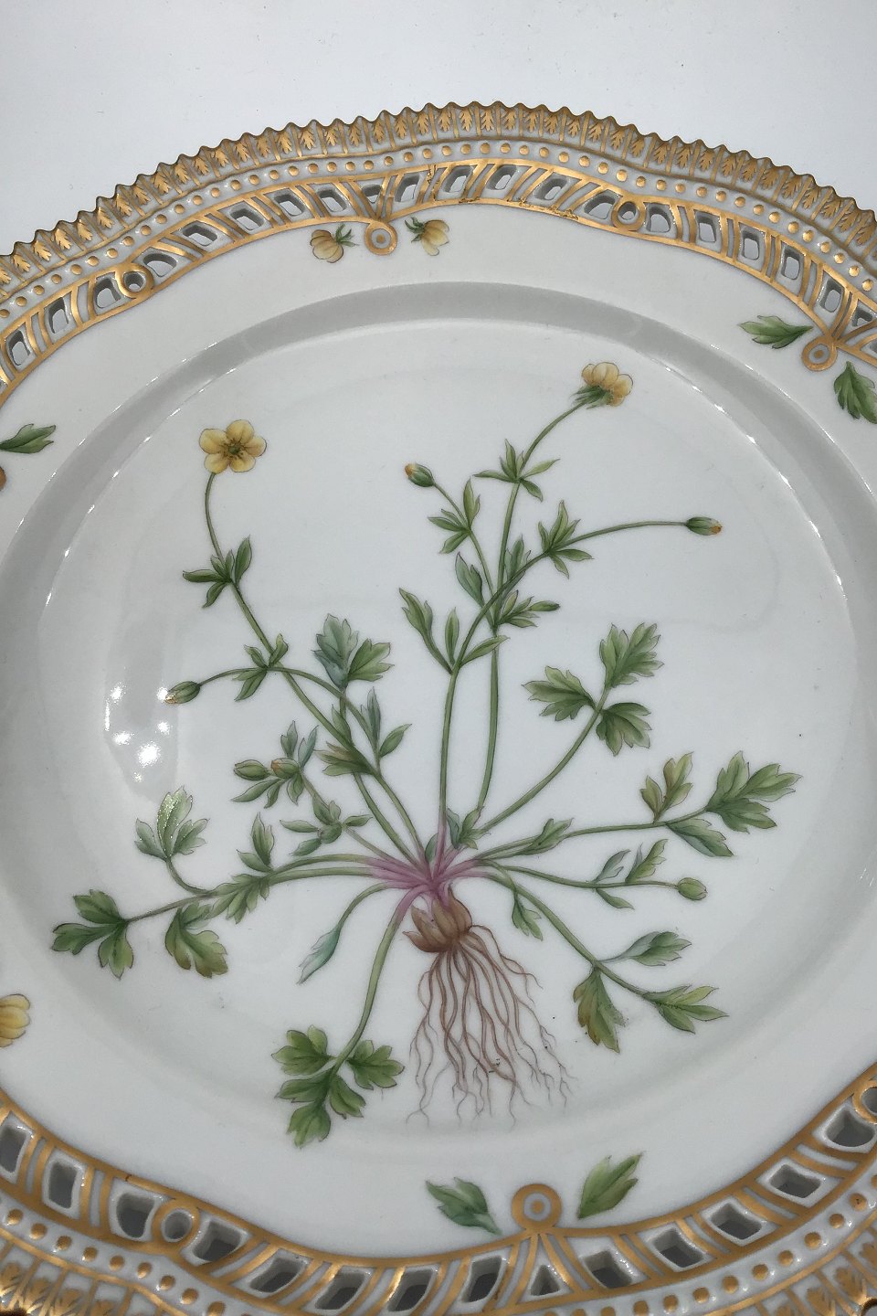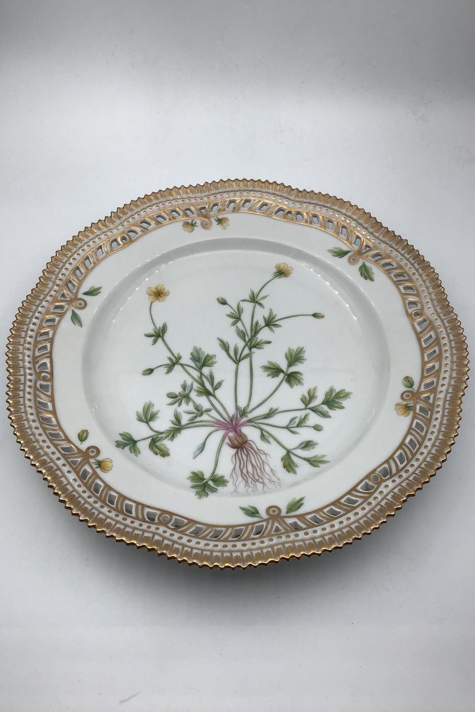 Royal Copenhagen Flora Danica tallerken med gennembrudt kant No 20/3553. Latinsk navn: Ranunculus Bulbosus L Måler 25,5 cm (10.03 inch)