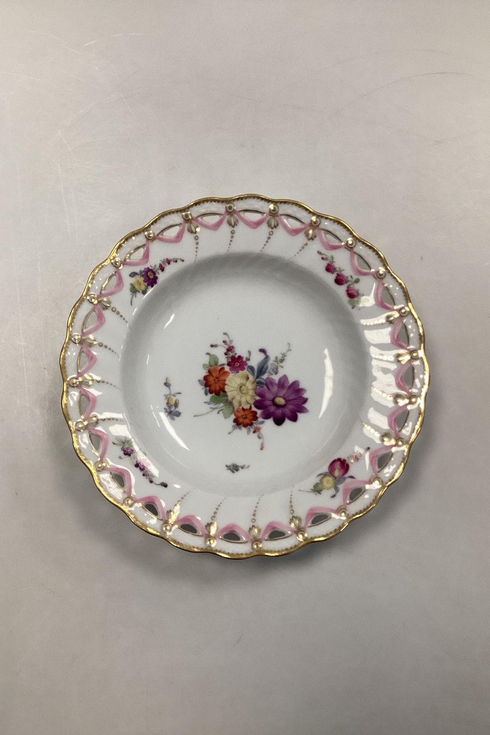 Royal Copenhagen Fuld Saksisk Blomst Dyb Tallerken med Gennembrudt Blondekant 1860-1890. 22.5 cm dia. I fin hel stand, med minimalt slid p� guldet.