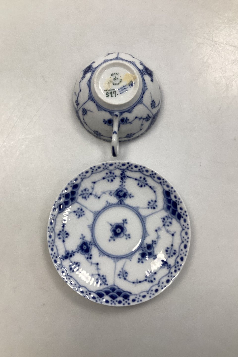 Royal Copenhagen Blue Flute Half Lace Coffee Cup and Saucer No. 756. Measures Cup: 3.5 cm / 1 3/8 in. x 7.5 cm / 2 61/64 in. dia. Saucer: 11.2 cm / 4 13/32 in.