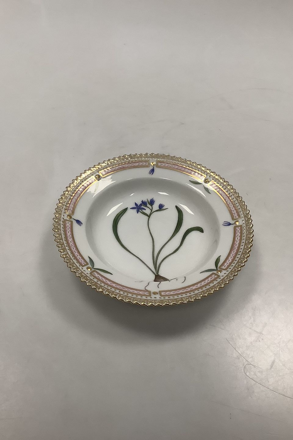 Royal Copenhagen Flora Danica Lille Dyb Tallerken No. 3590. Latinsk Navn: Scilla Bifolia oed. 14.5 cm diameter. I perfekt stand.