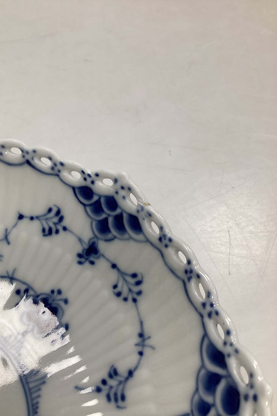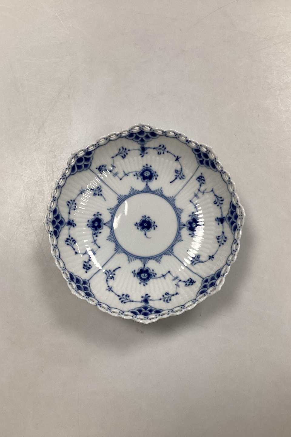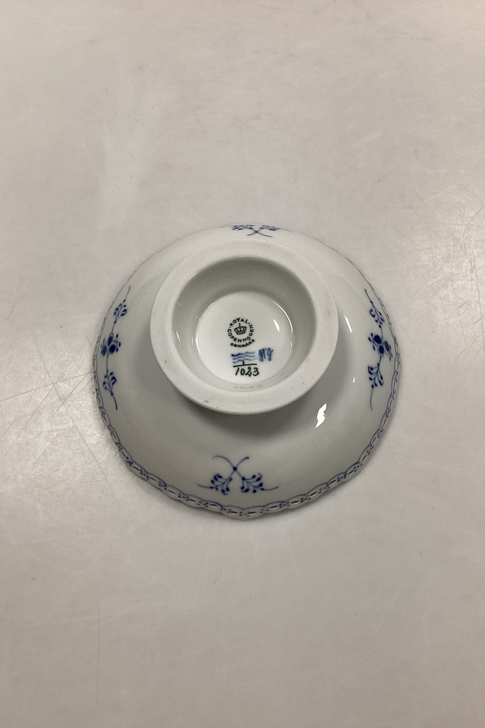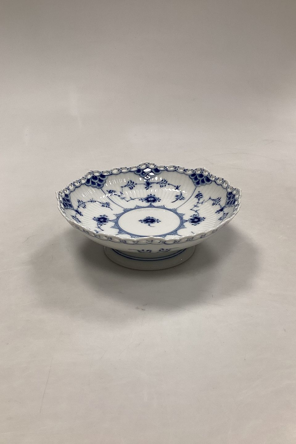 Royal Copenhagen Musselmalet Helblonde Skål på Fod No 1023. Måler 17,5 cm (6 57/64 in.) 1. sortering. Har limet tak