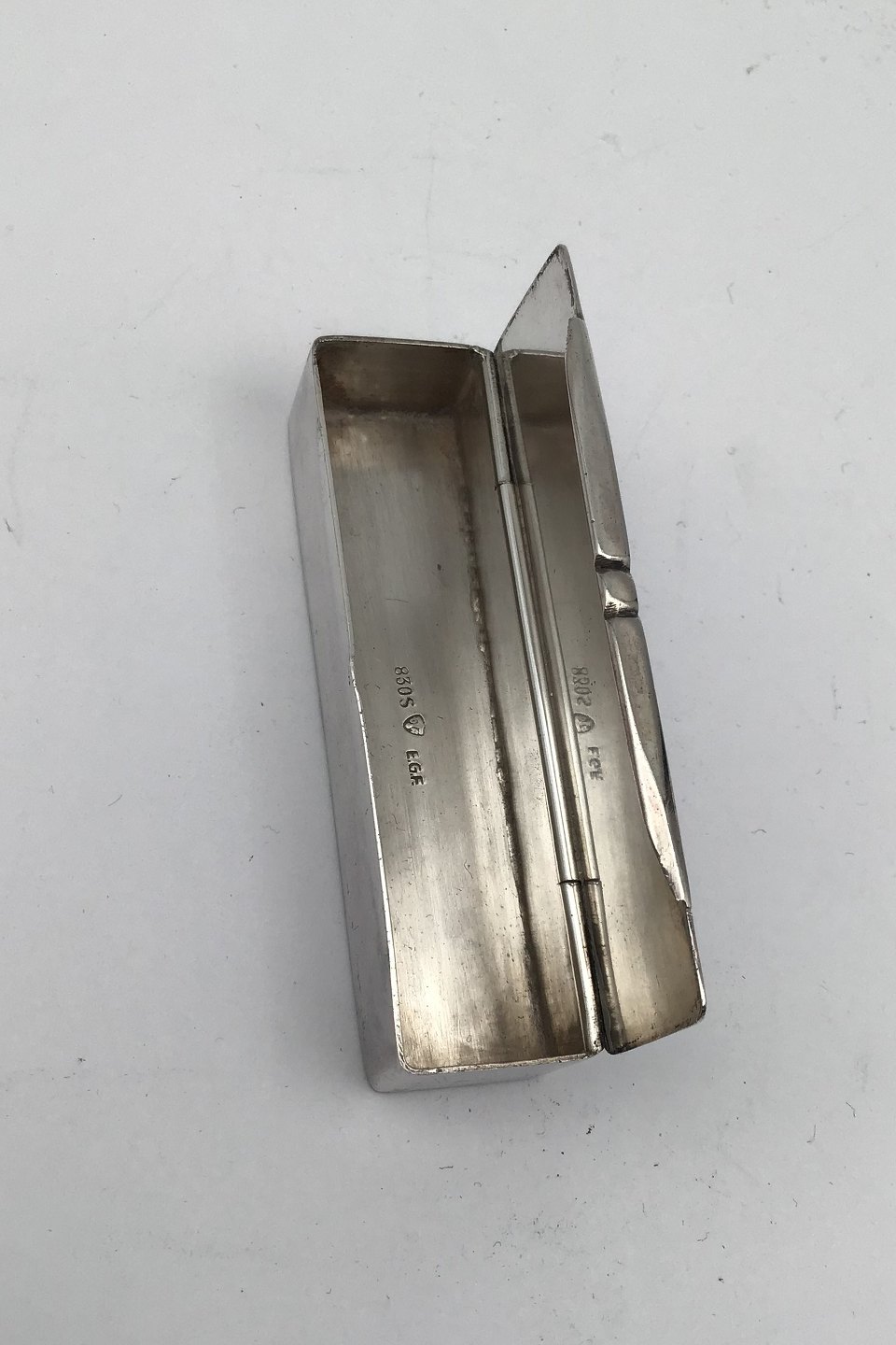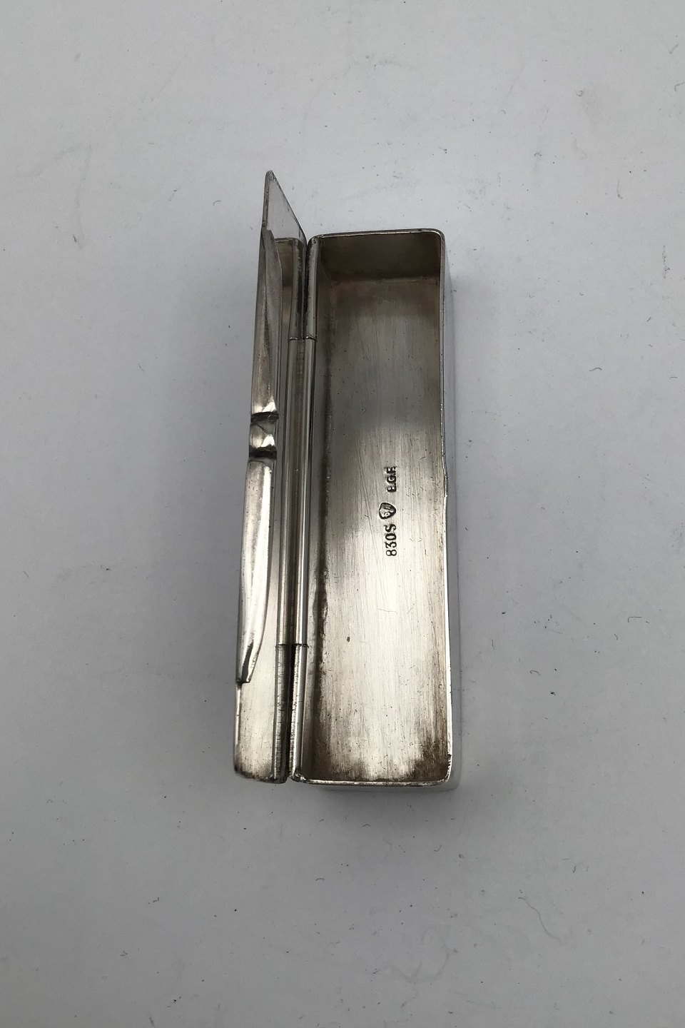 F.E.G Frederiksen Silver Pill Box Measures 8 cm x 2 cm x 1.5 cm (3.15 inch x 0.78 inch x 0.59 inch) Weight 46 gr (1.62 oz)