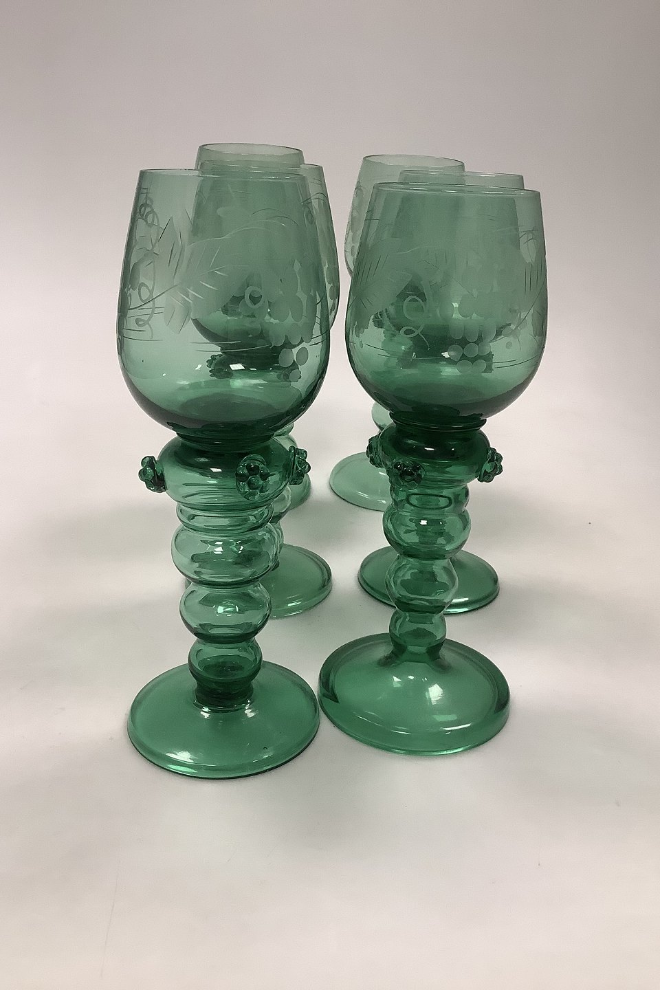 Sæt på 6 Grønne rømerglas med rosetter og ombøjet fod /fladbund