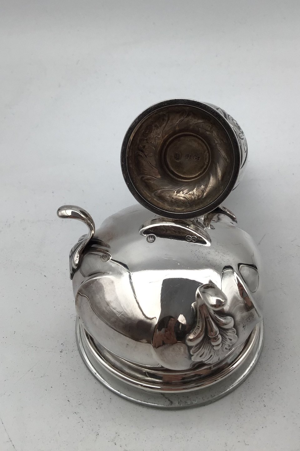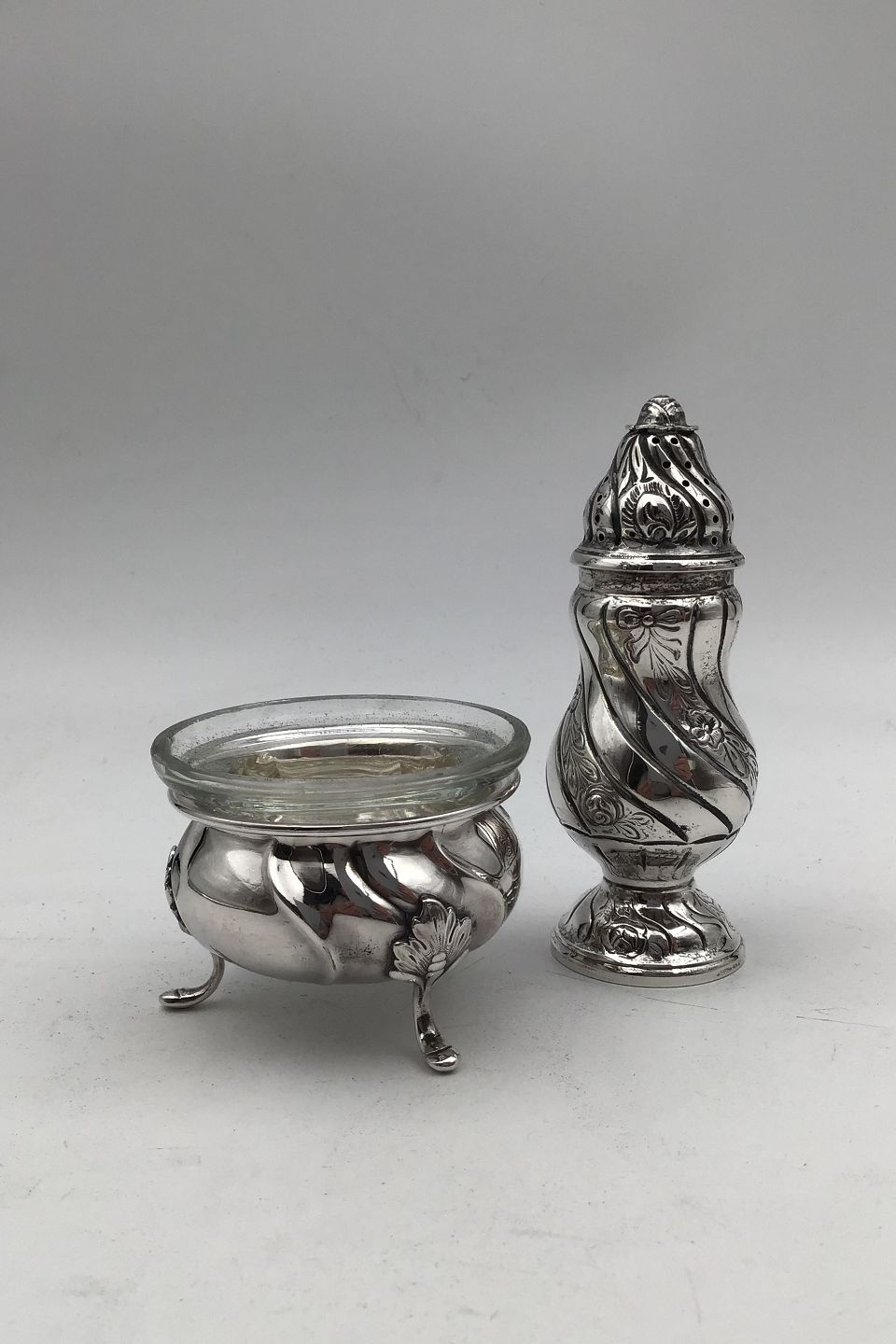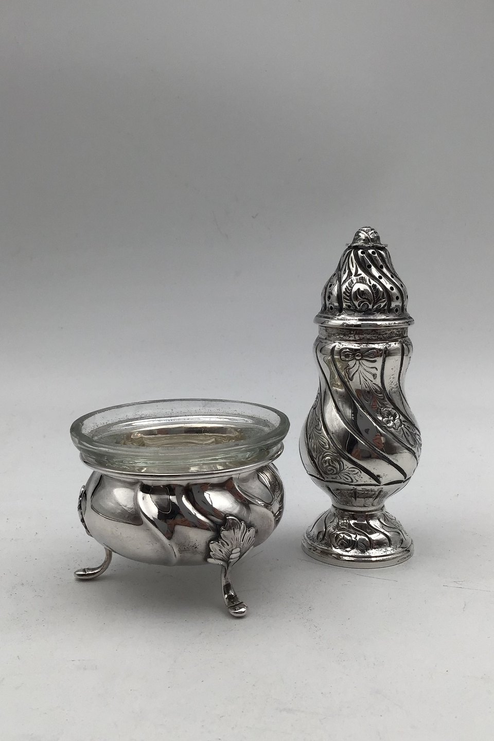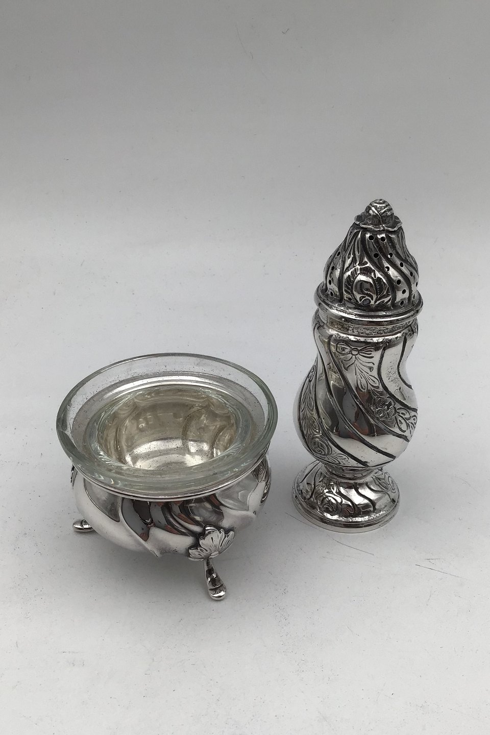 Cohr/Grün Silver Salt and Pepperset Measures Cohr Salt Cellar H 4 cm (1.57 inch) Diam 6 cm (2.36 inch) Grün Pepper Pot H 10 cm (3.93 inch) Combined weight incl glas insert 131 gr. (4.61 oz) (Chips)