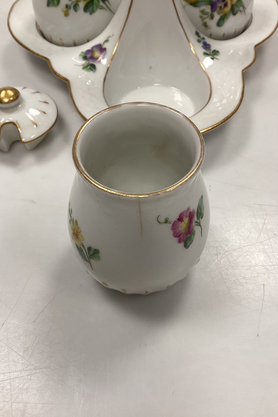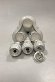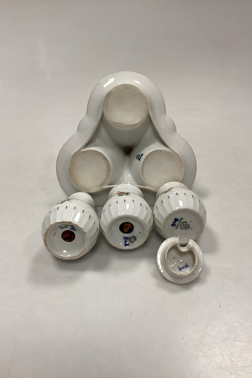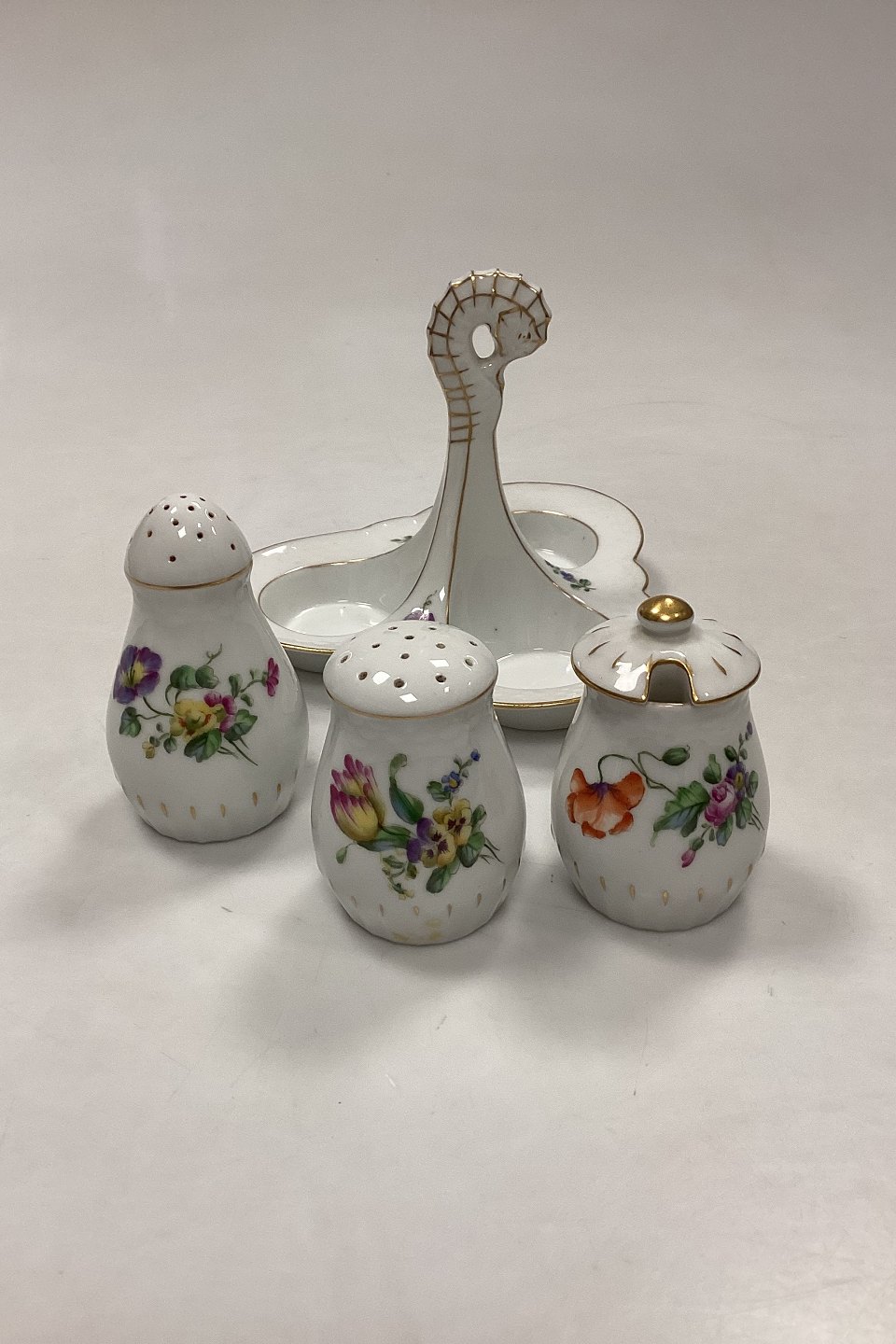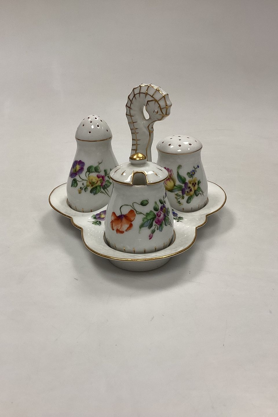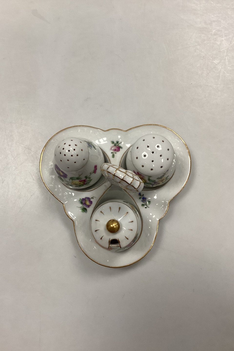 Bing og Grøndahl Saksisk Blomst, Hvid Plat-de-ménage No. 52. Trekantet fad med søhestehank, salt- og peberbøsse og sennepskrukke.
