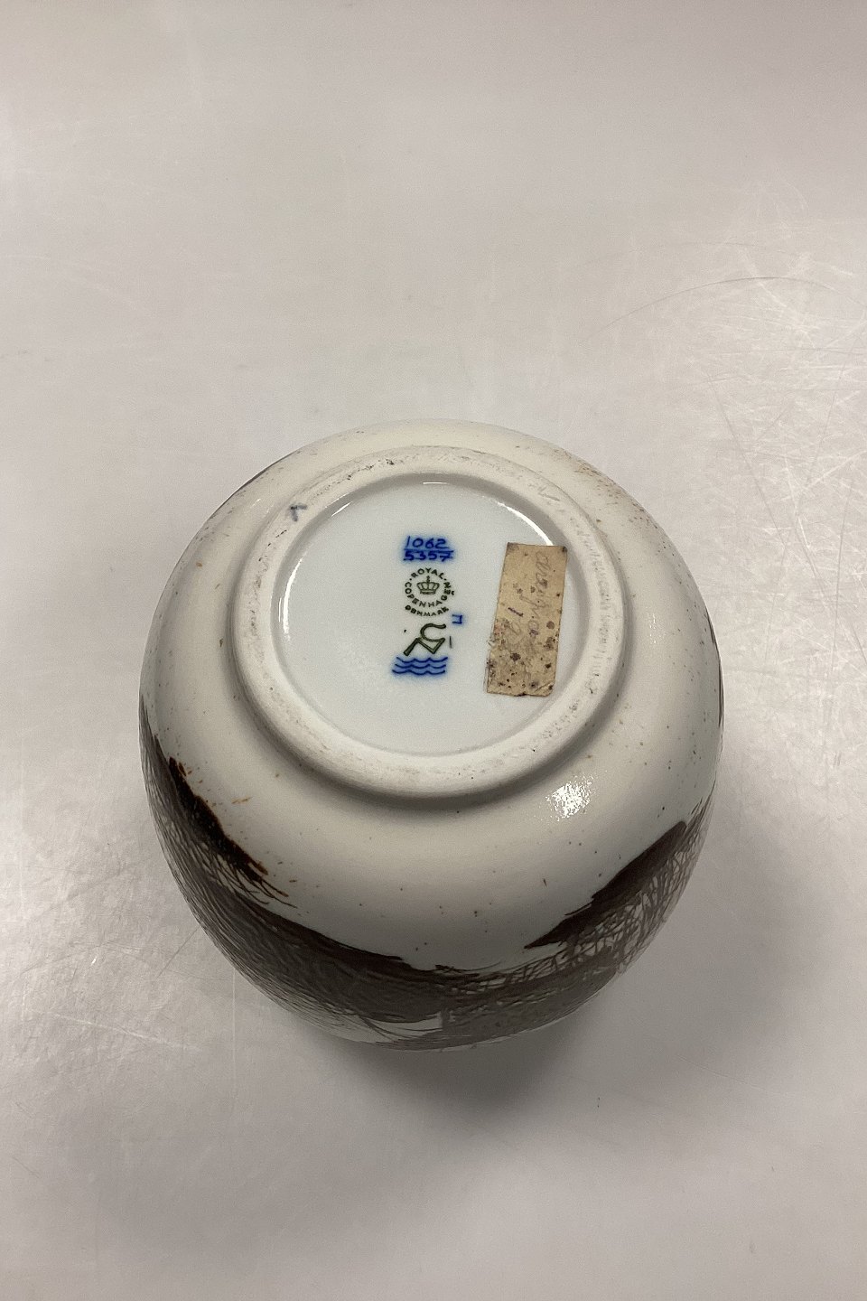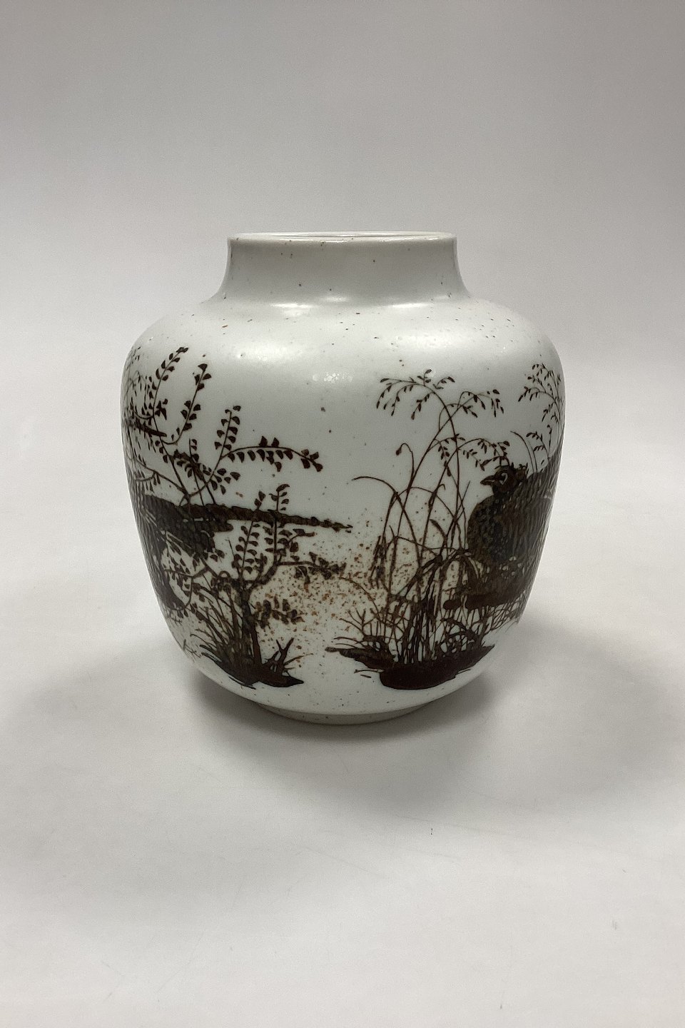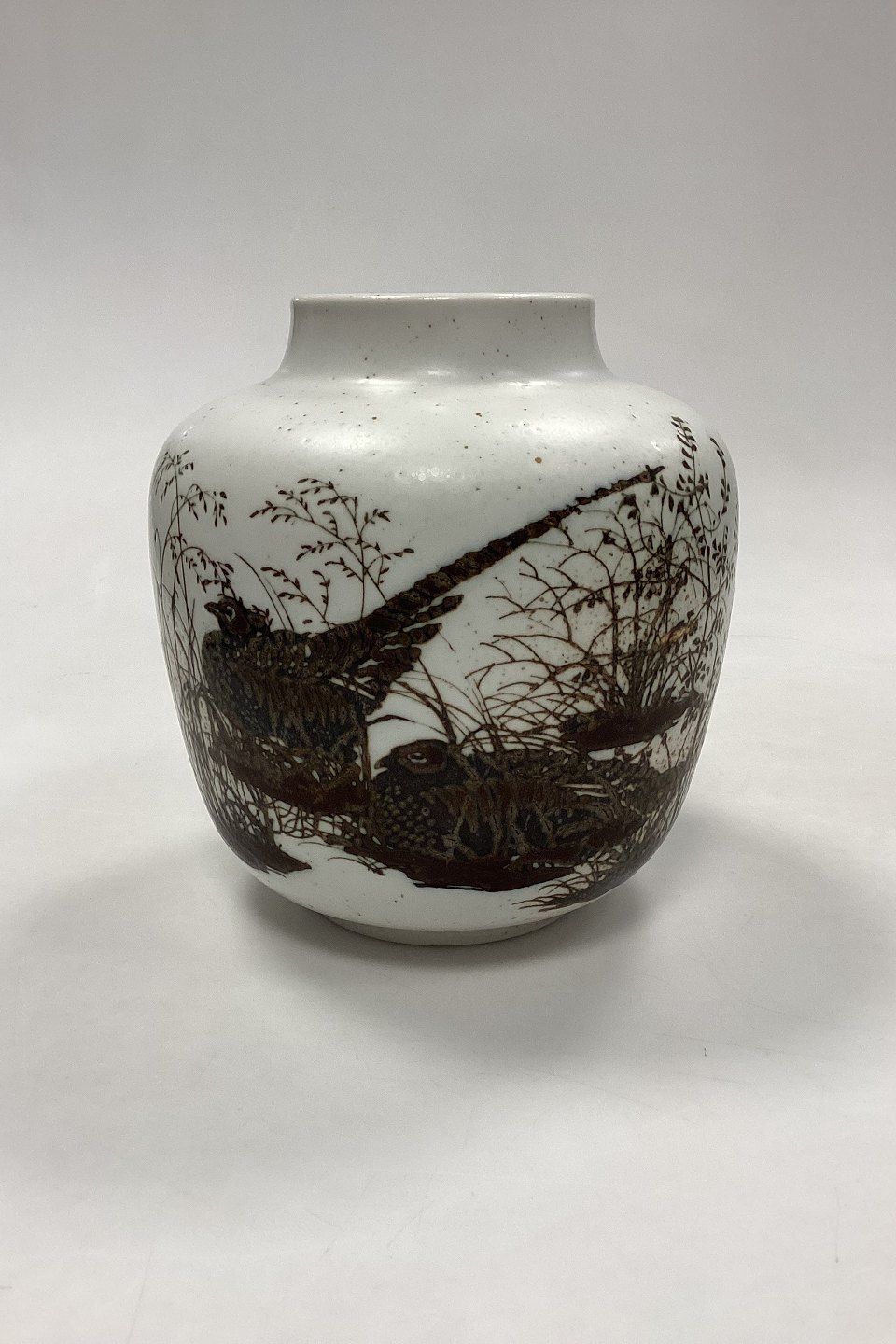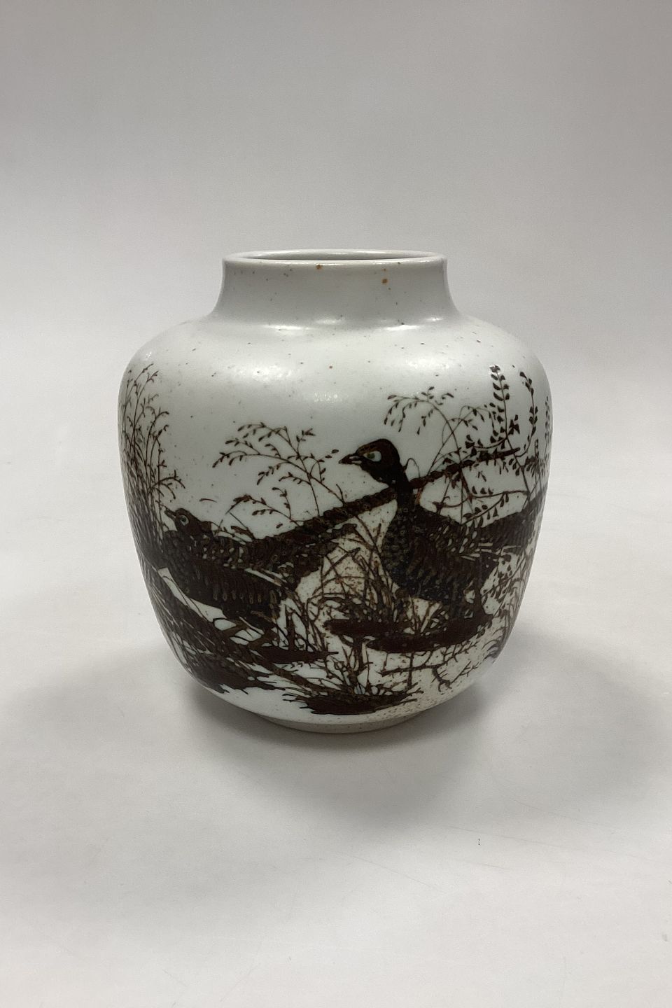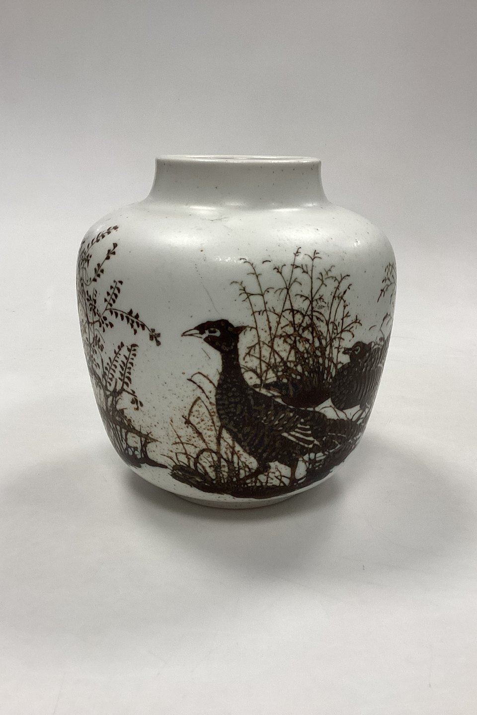 Royal Copenhagen Fajance Diana Vase med Fasaner No.1062/5357. Brunt motiv på hvid baggrund. Designet af Nils Thorsson. Måler 18 cm x 16 cm / 7,08 in. x 6,29 in. 1. Sortering.