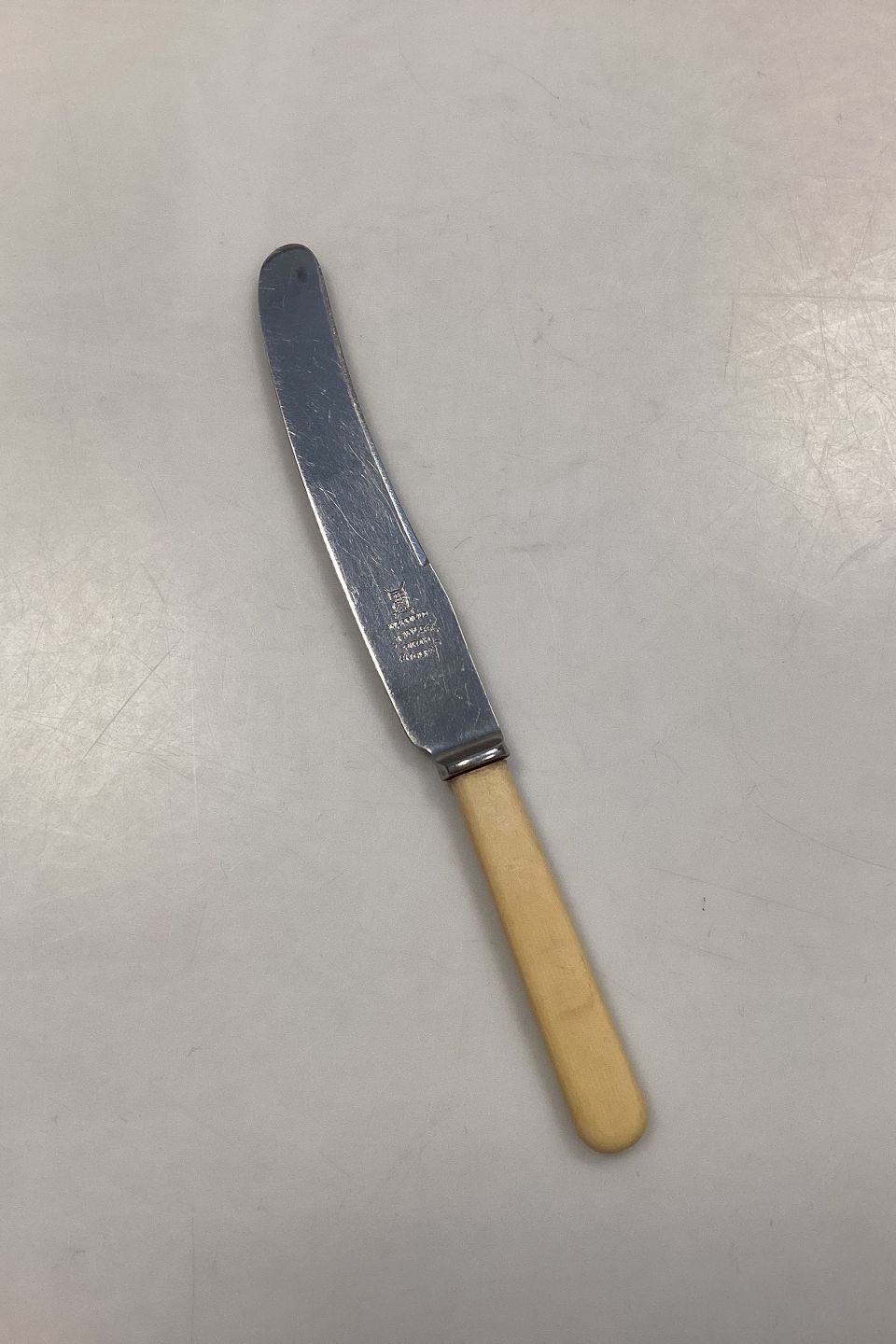 Firth Sheffield Stainless Spisekniv med skaft i hvidgul bakelit. Måler 23,7 cm / 9,33 in. Brugt men i god stand.