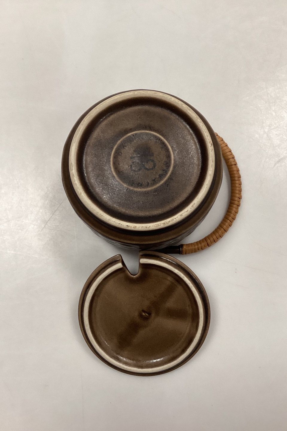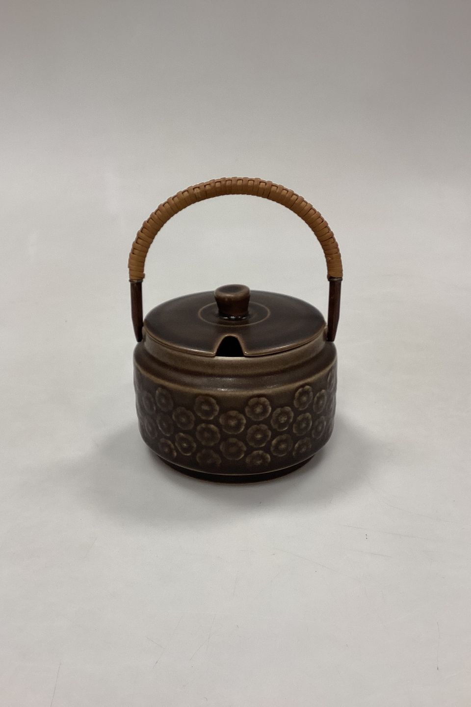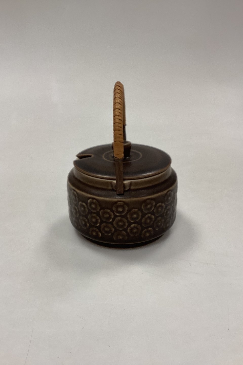 Bing and Grondahl Kronjyden Brown Azur Marmelade Jar with lid and bast handle. Measures 10.5 cm / 4 9/64 in. x 7 cm / 2 3/4 in.