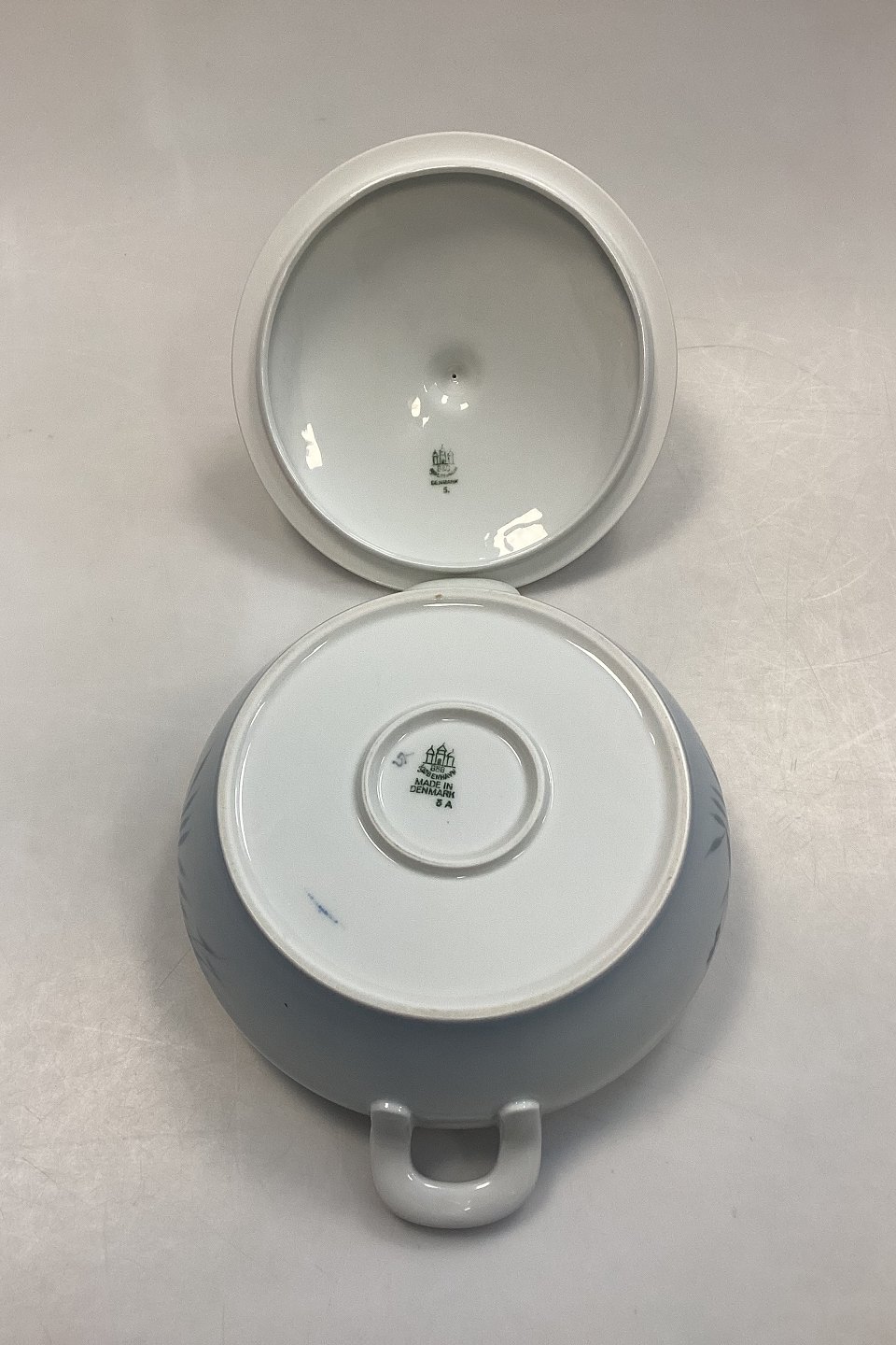 Bing og Grøndahl Hvid Demeter / Kornblomst Lågfad No. 5A. Måler 24,5 cm x 14 cm / 9,64 in. x 5,51 in. fra håndtag til toppen af knoppen.