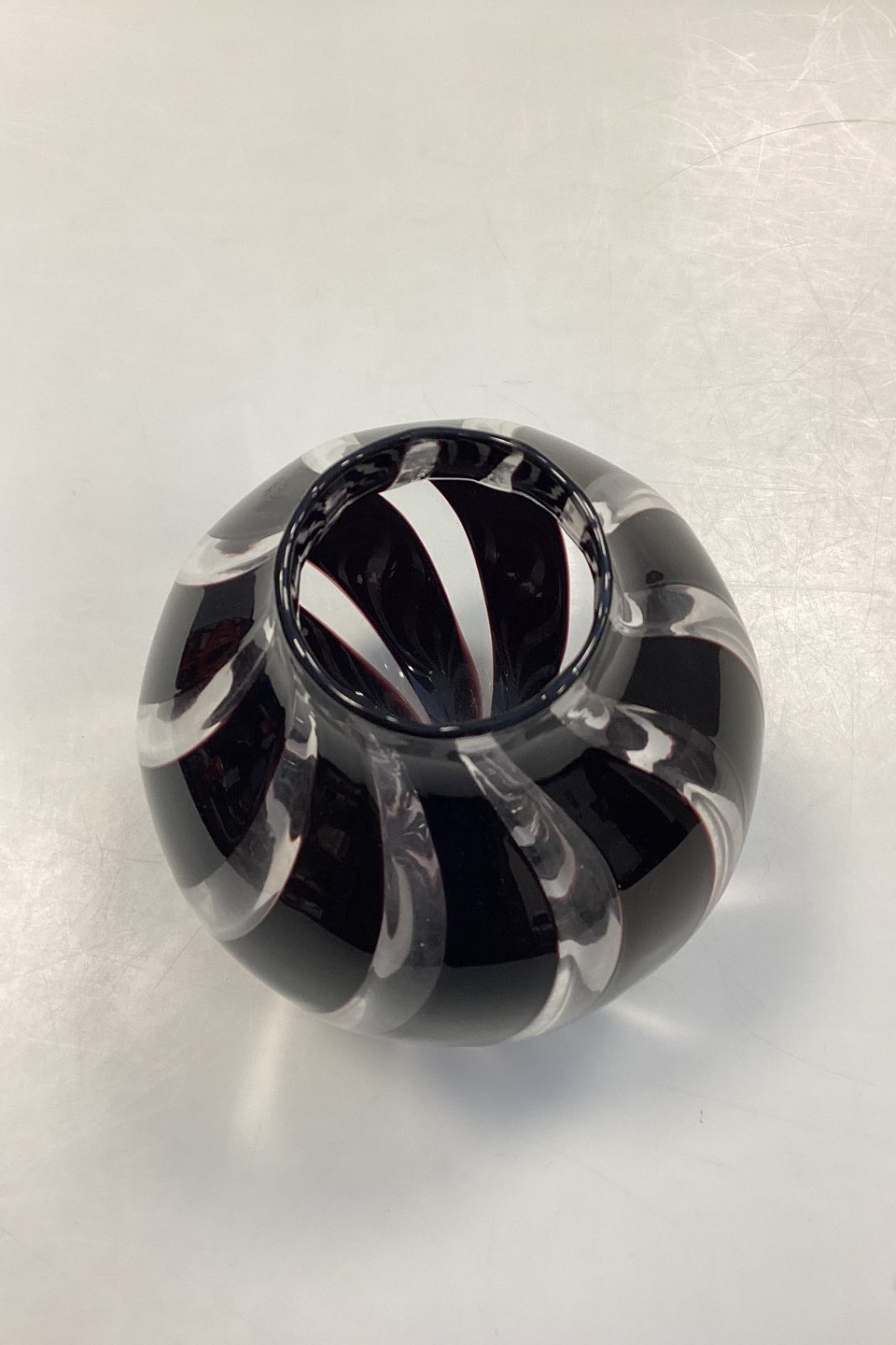Glasvase af Peter Svarrer i sorte og hvide striber. Signeret i bunden. Måler 16,5 cm / 6,5 in.