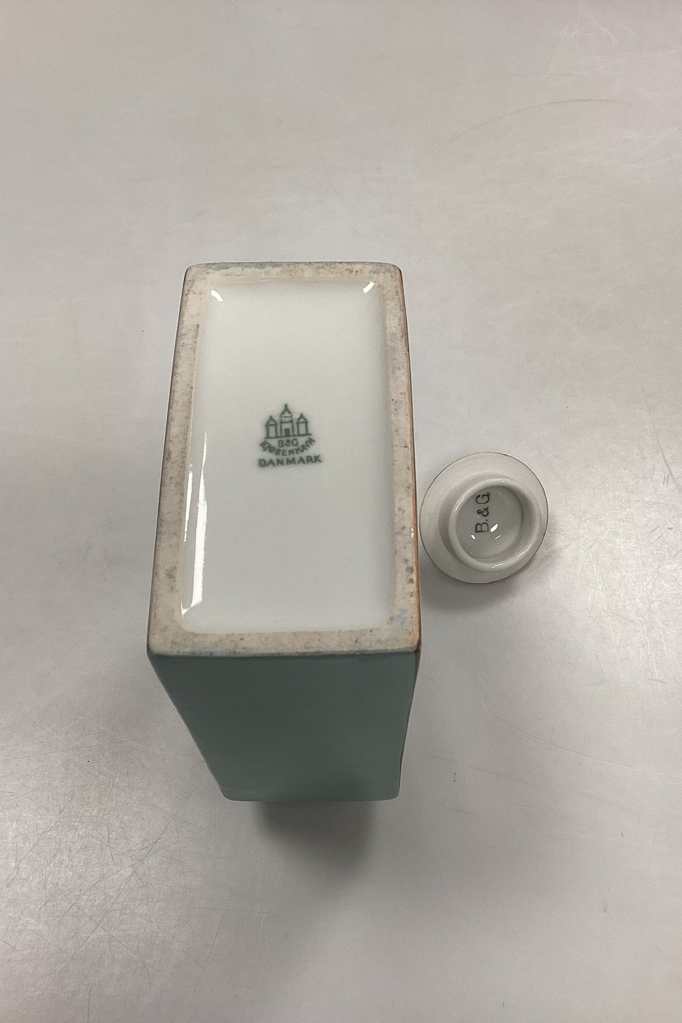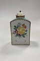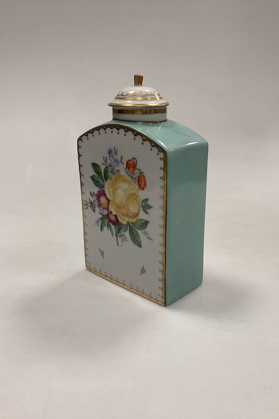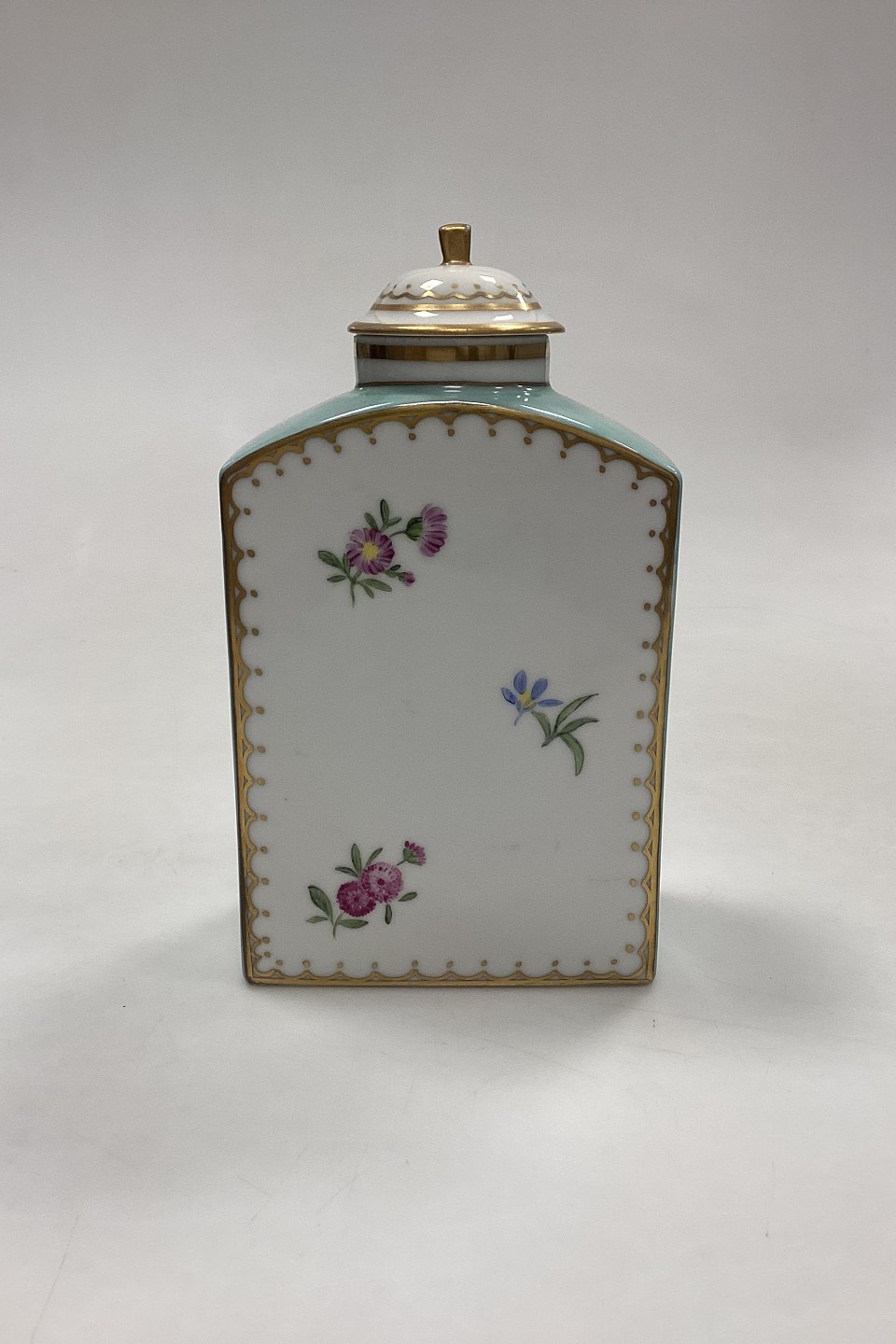 Bing and Grøndahl Tea Jar No. 650 with floral motif on a white background, and decoration in pistachio green and gold.