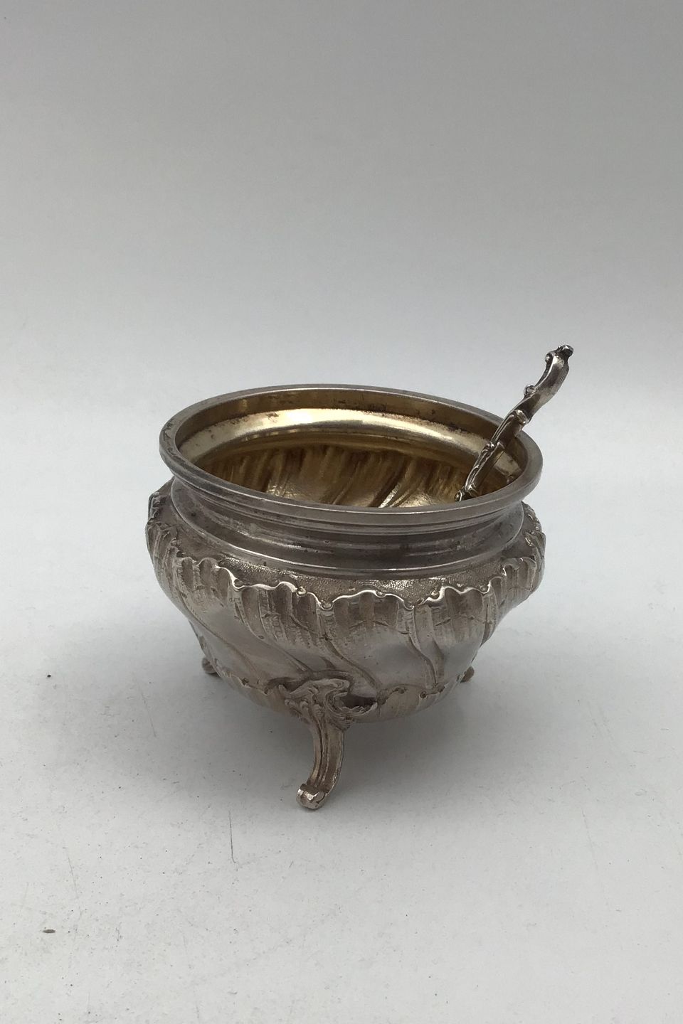 French Silver Salt Cellar + Salt Spoon Measures Salt Cellar Diam 6.5 cm (2.55 inch) H 5.2 cm (2.04 inch) Spoon 7 cm (2.75 inch) Combined Weight 73 gr (2.58 oz)