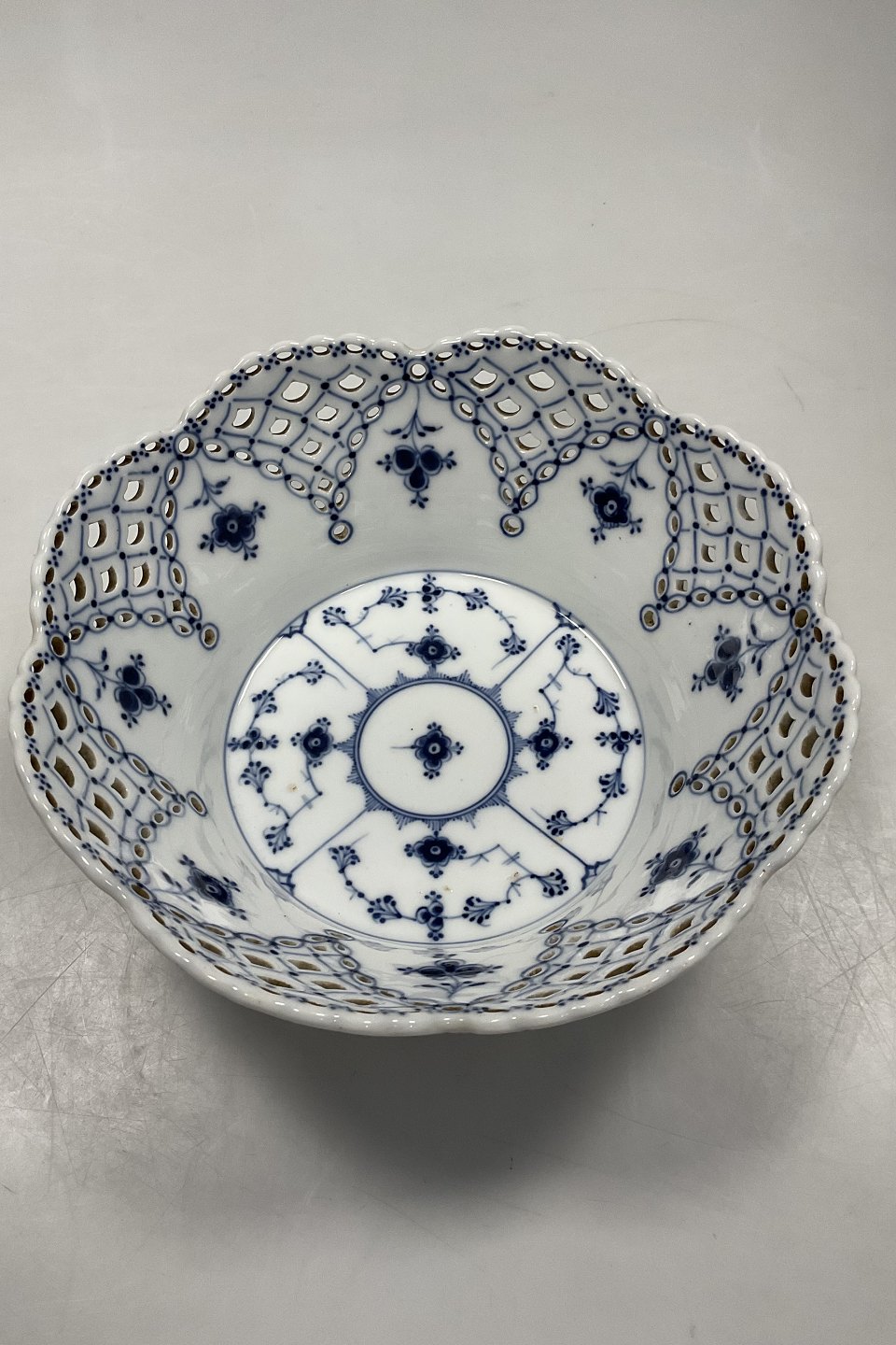 Royal Copenhagen Blue Fluted Full Lace Fruit bowl No 1061. Måler 9cm / 3.54 inch high and 23cm dia/ 9.06 inch. In perfect condition.