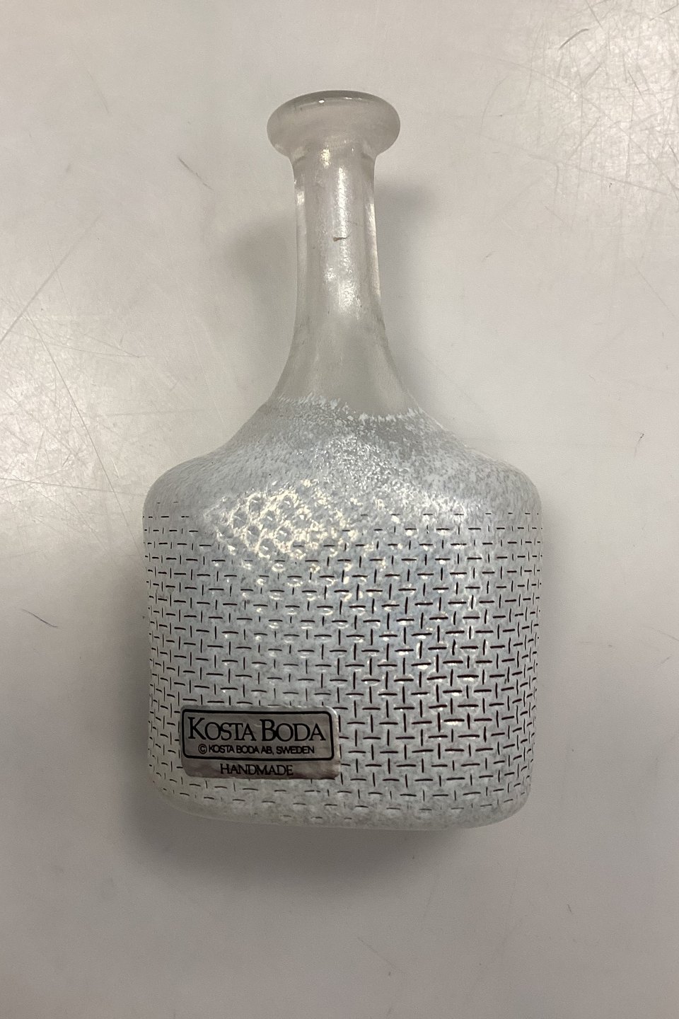 Kosta Boda Network Vase. Designet af Bertil Vallien. Miniaturevase i mundblæst glas med iriserende hvid net-dekoration. Signeret: Kosta Boda Artist Coll B Vallien 48012.