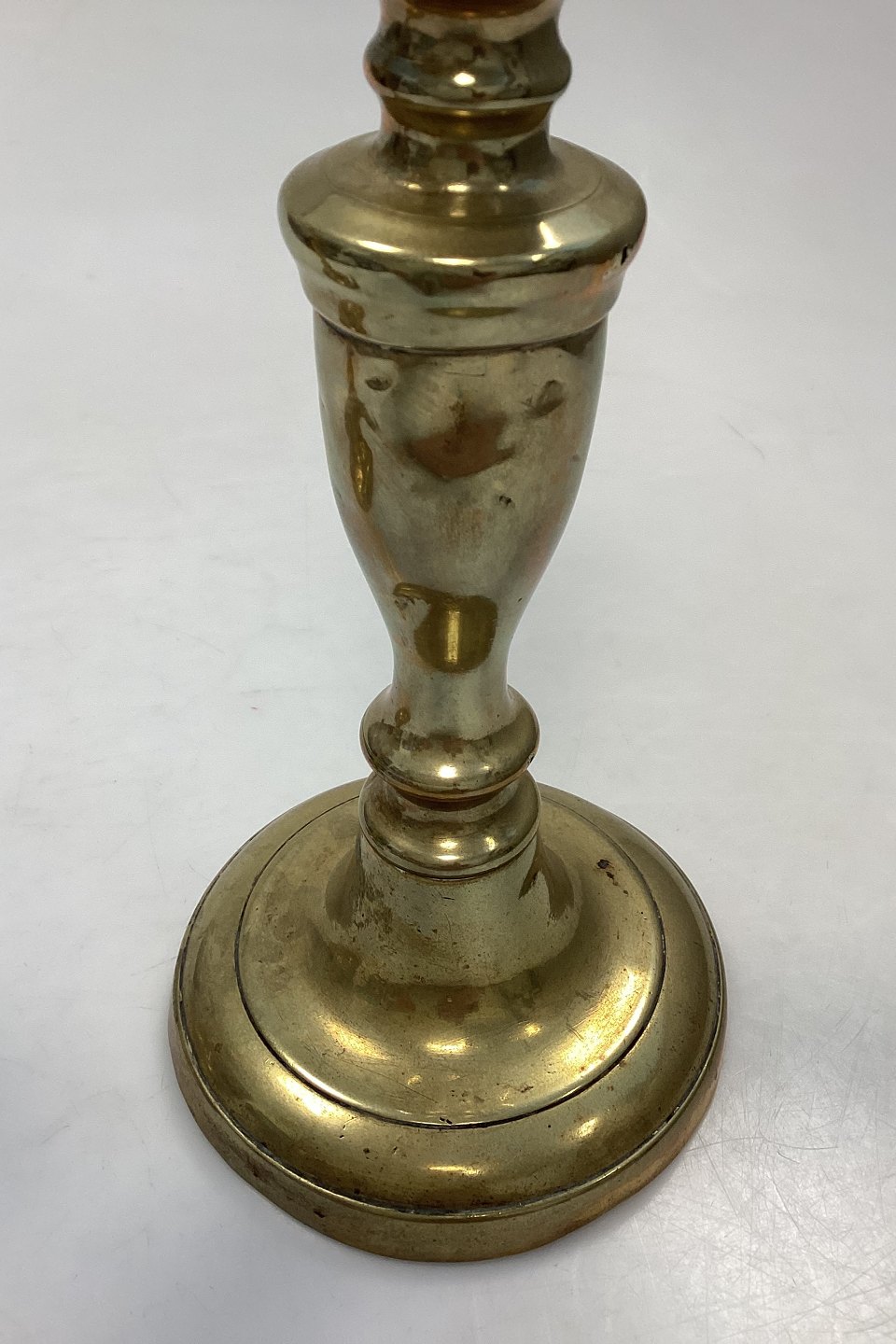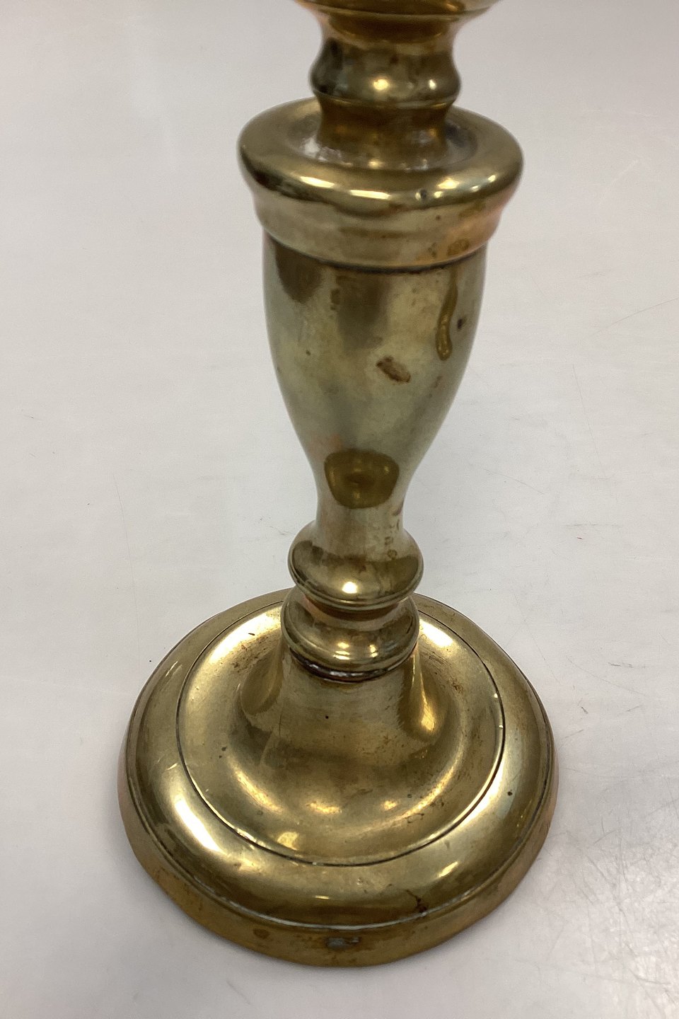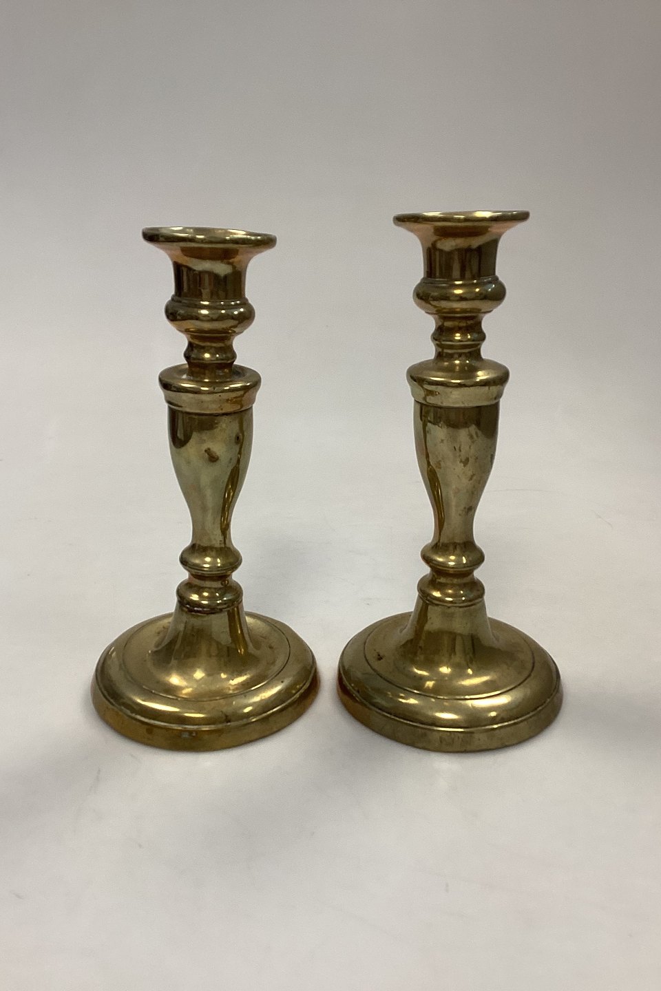 Antique pair of tall Candlesticks in Brass. Light wear, dents and scratches.