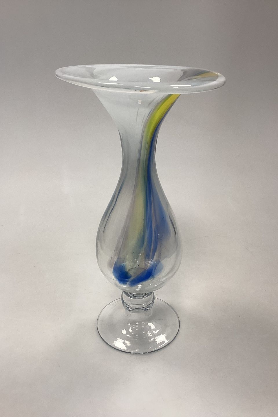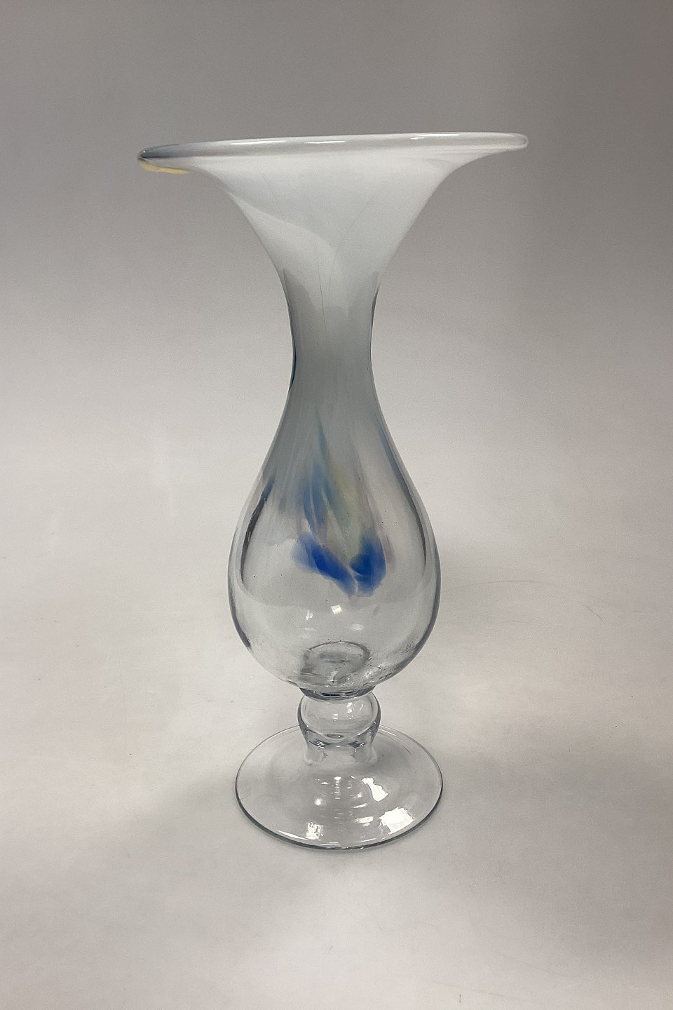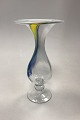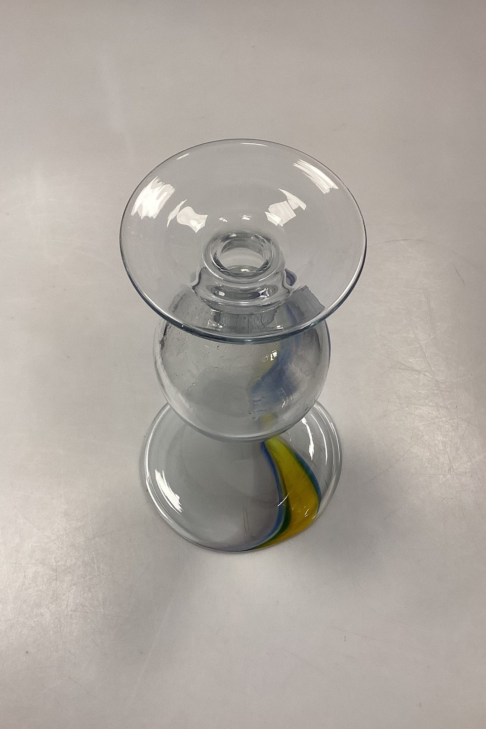 Holmegaard Cascade Glasvase / Lysestage. Designet af Per Lütken. Skålen er opalhvid øverst, med multifarvede gule og blå toner. Signeret HG5 PL på øverste kant.