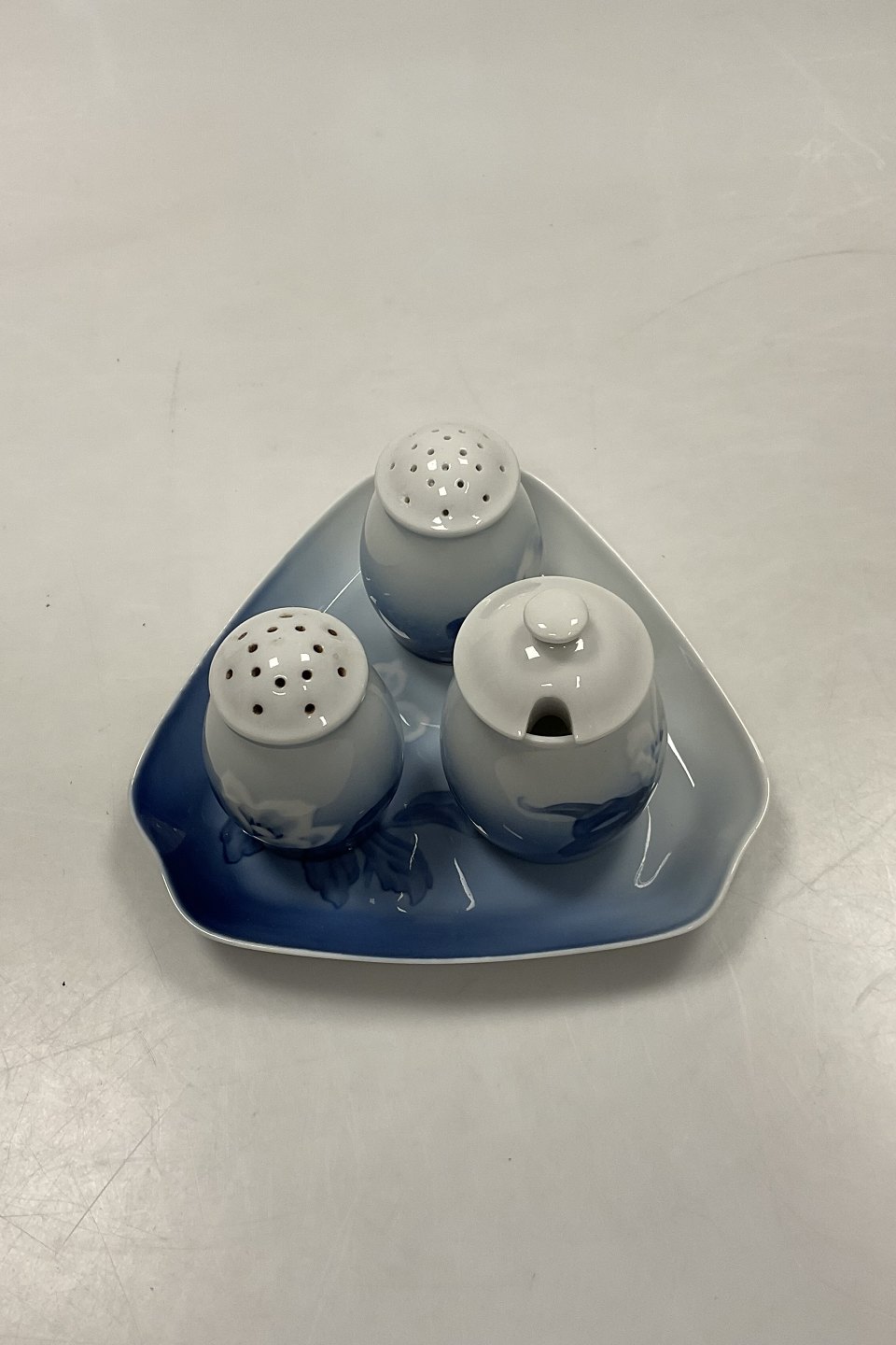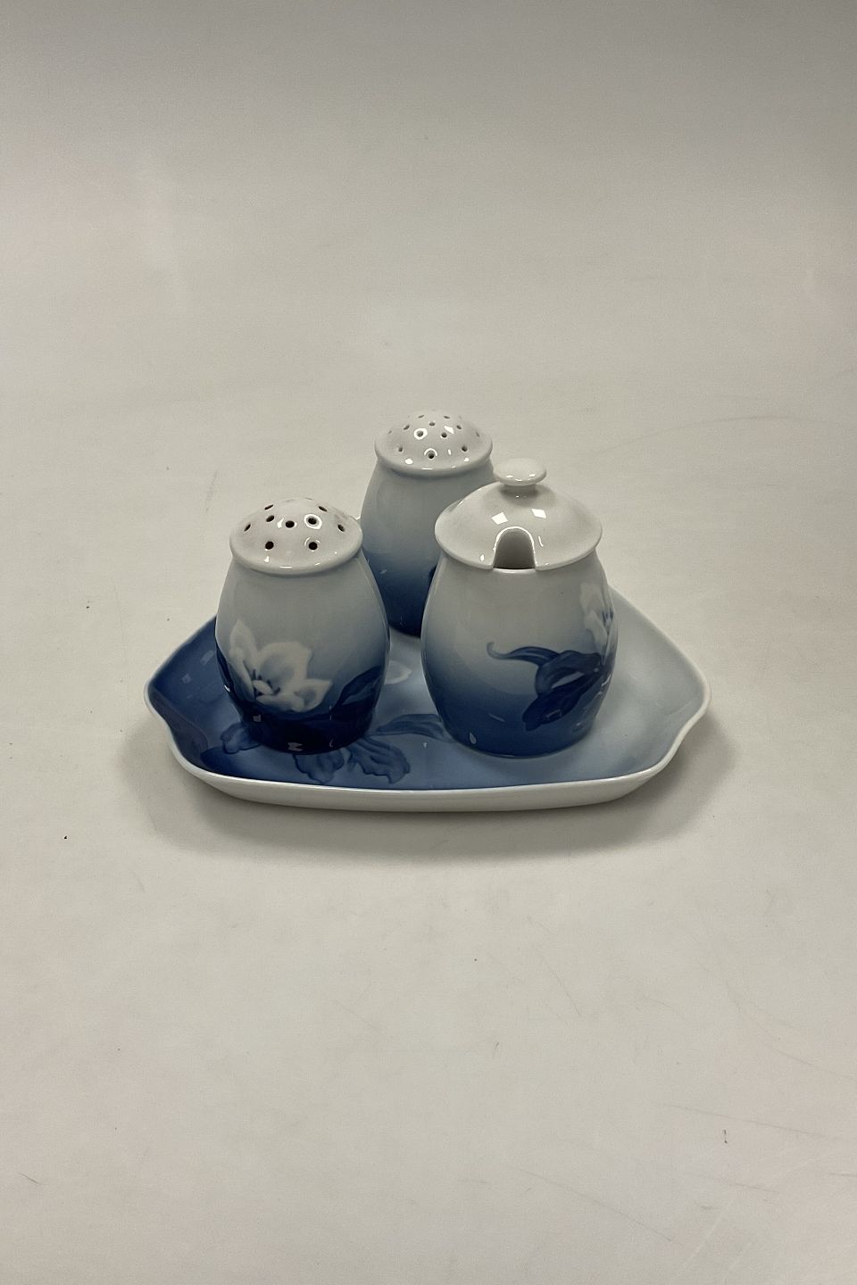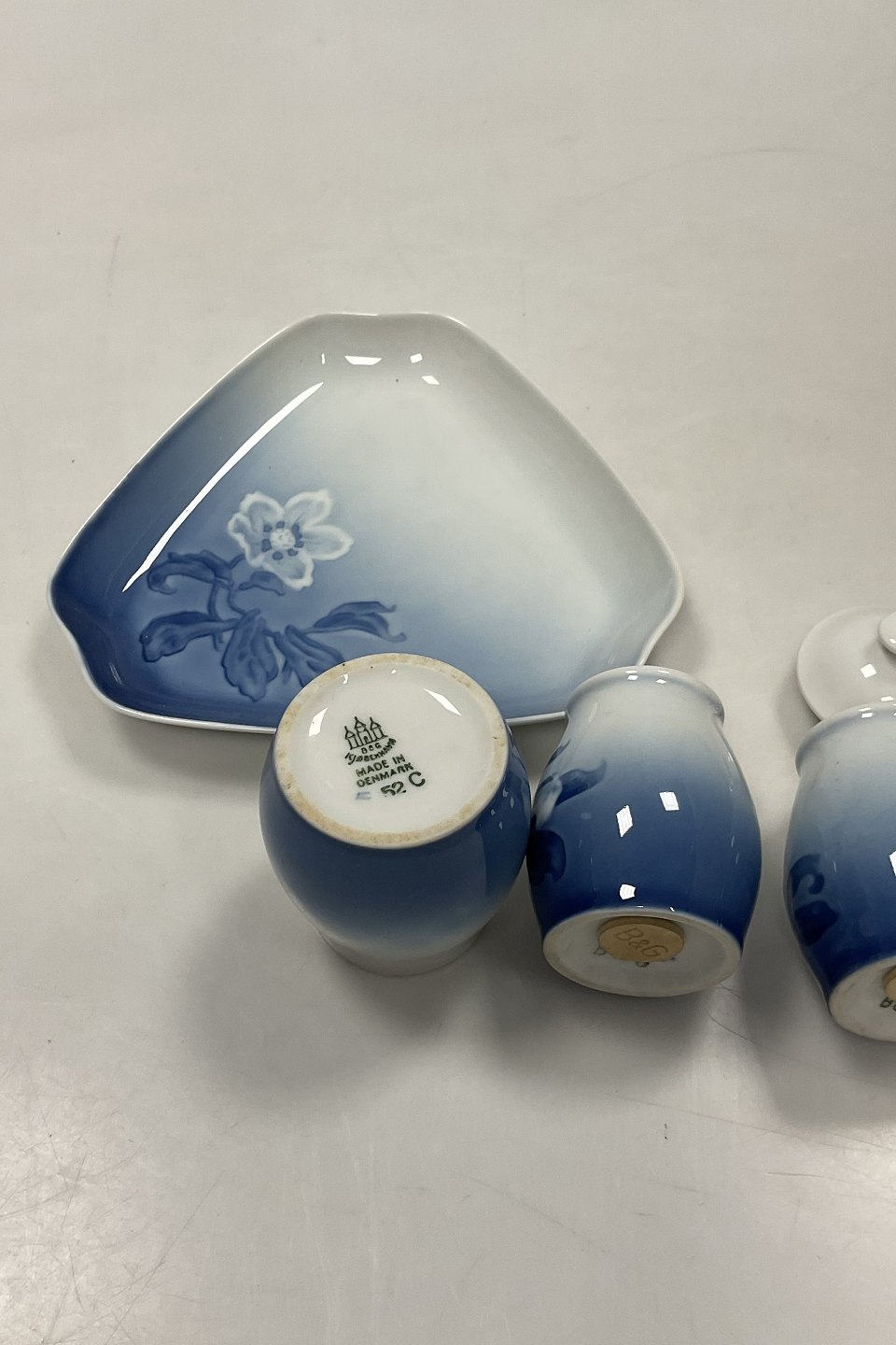 Bing og Grøndahl Julerose Plat-de-ménage No 52. Fad No 52D måler 16 cm (6.39 inch ). Sennepskrukke No 52C og Salt- og pebersæt måler 7-8 cm (3 5/32 in).