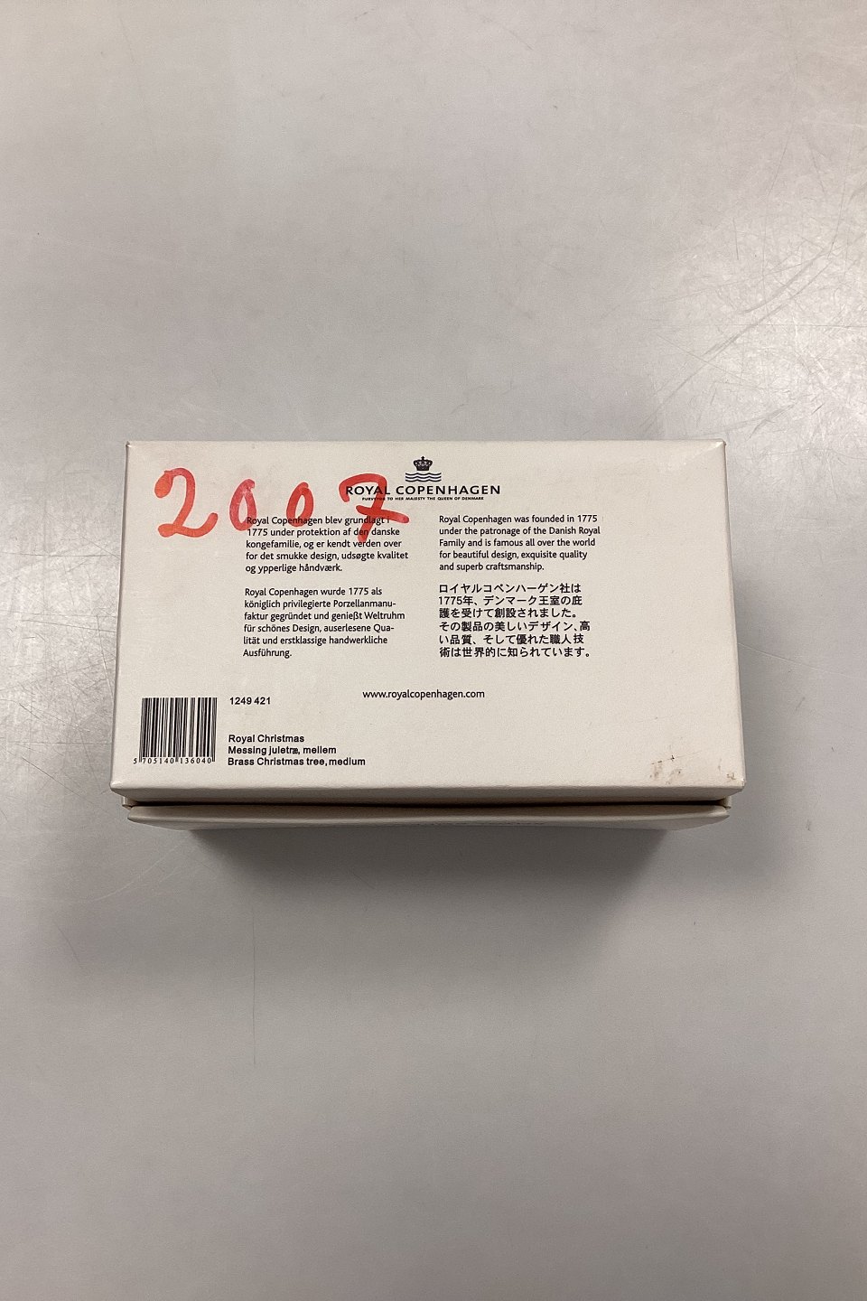 Royal Copenhagen Christmas Mellem Juletræ. Bordpynt i messing med grøn emalje og guld kræmmerhuse.