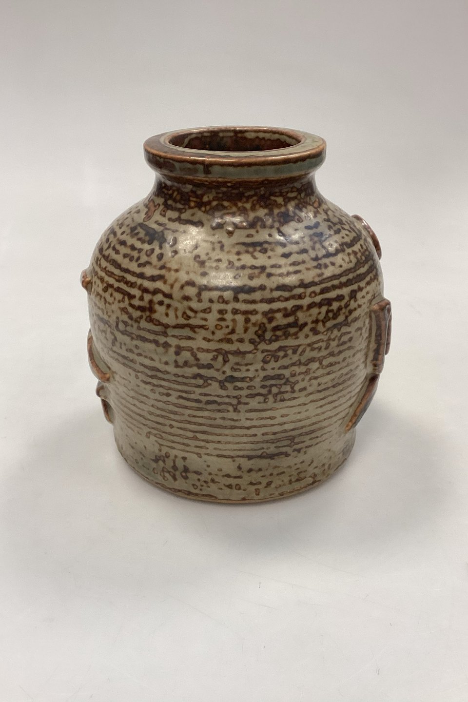 Royal Copenhagen Jørgen Mogensen Stentøjsvase No. 21484. Med fuglemotiver. Fremstår med brændingsrevne på kant /(se billede)