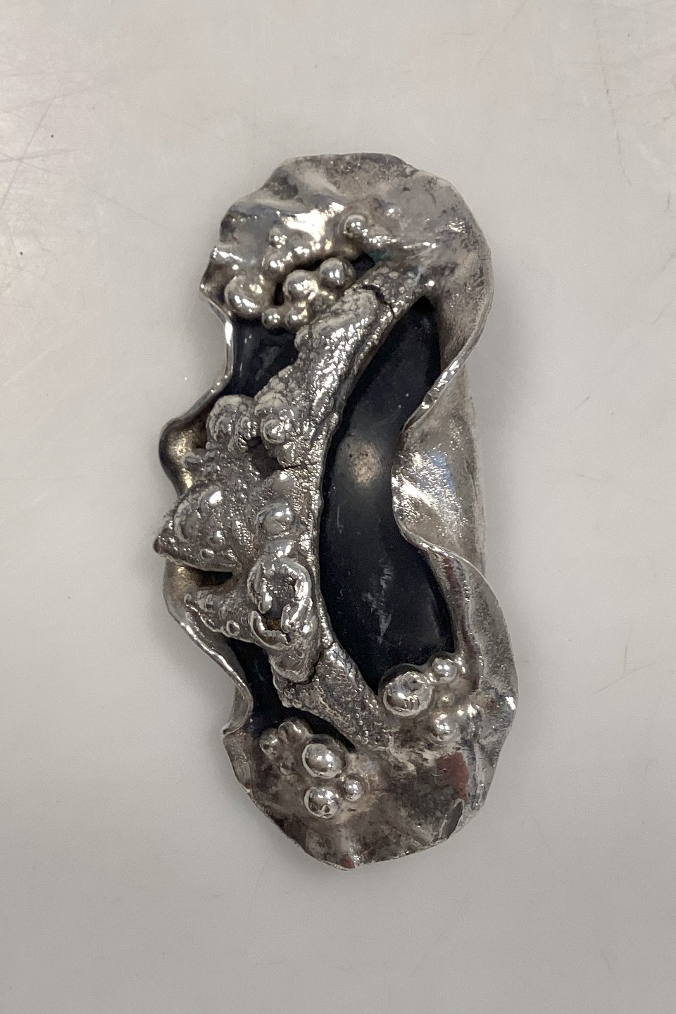 Ornamented Jacob Hull Brooch in Silver Plated Metal with Black Stone