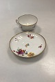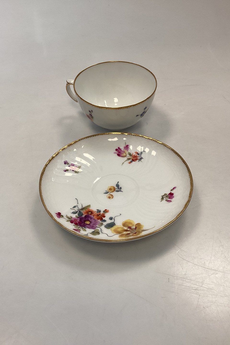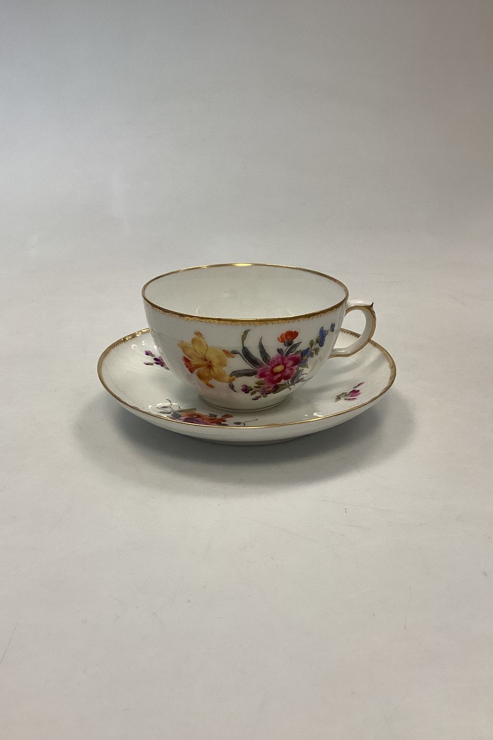 Royal Copenhagen Full Saxon Flower Large Teacup No. 1550. In fine condition, but slight wear on the gold rim. Cup measures 11 cm x 6.5 cm / 4.52 in. x 2.55 in. Saucer measures 16.5 cm / 6.5 in.