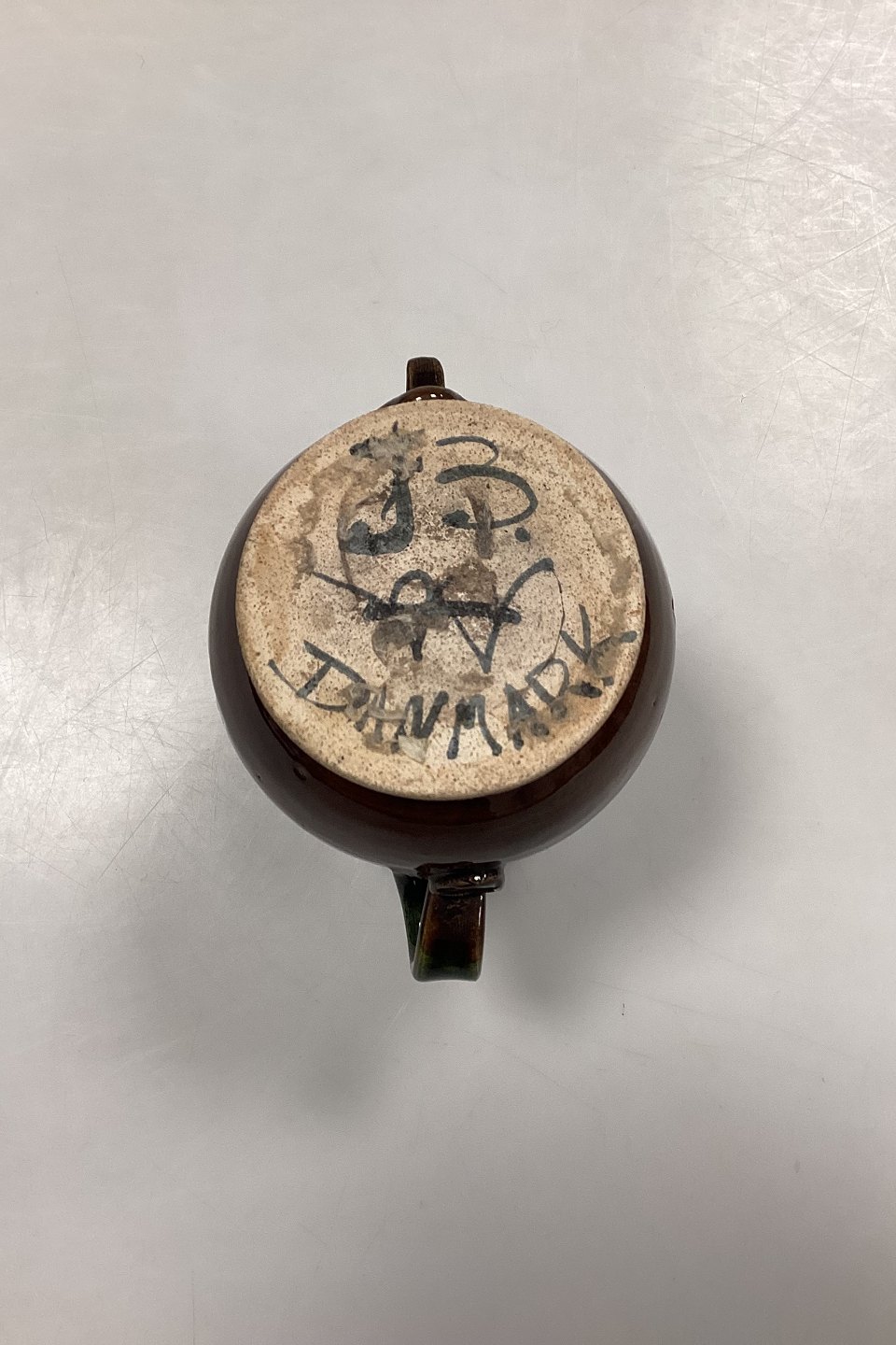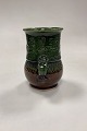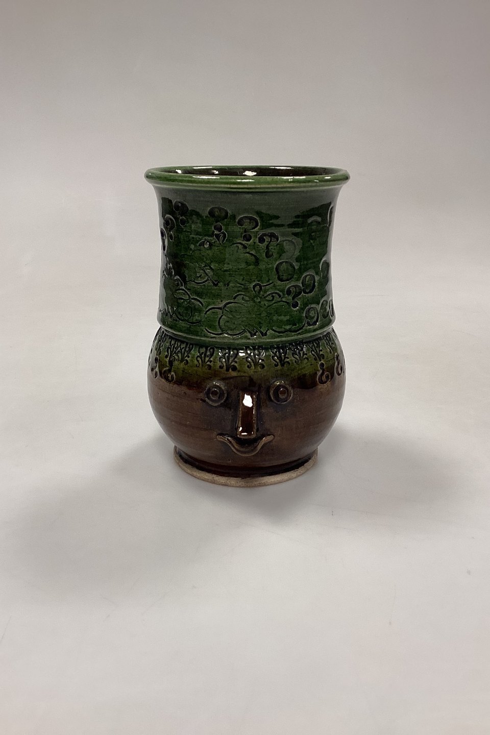 Bjørn Wiinblad Vase in glazed Stoneware. Motif with face, handle and embossed stencil patterns in brown and green glaze.