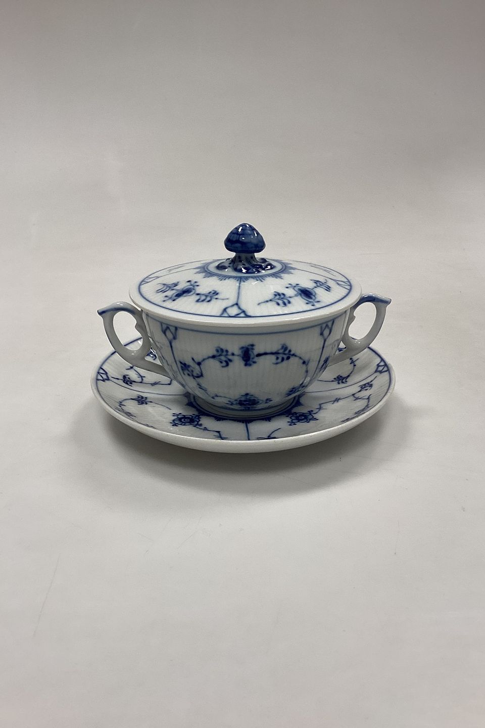 Royal Copenhagen Musselmalet Riflet Bouillon Kop med Underkop No. 2199. Måler: Kop i dia. 11 cm / 4,33 in. Underkop 16,3 cm / 6,42 in. 3. Sortering.