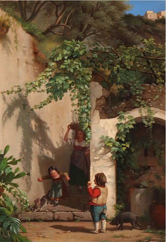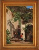 "Italiensk scene med moder og 2 børn" Olie maleri på lærred.