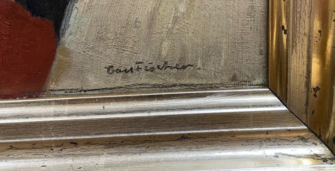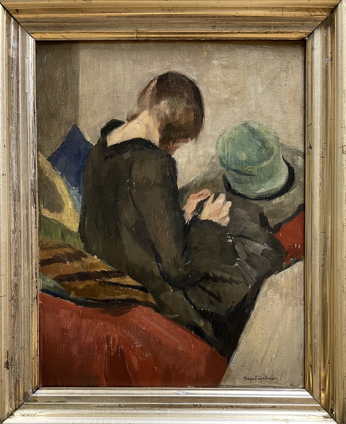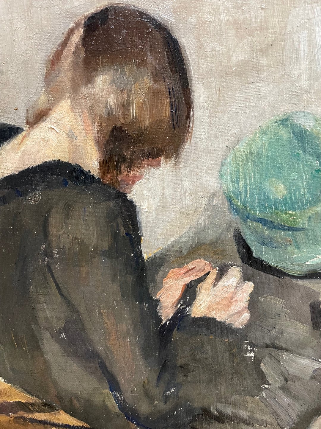"Interiør med ung kvinde" Oliemaleri på lærred i sølv ramme.