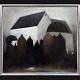 "Kirken ved vintertid" Olie maleri på lærred, monteret i bred sølv svæveramme.