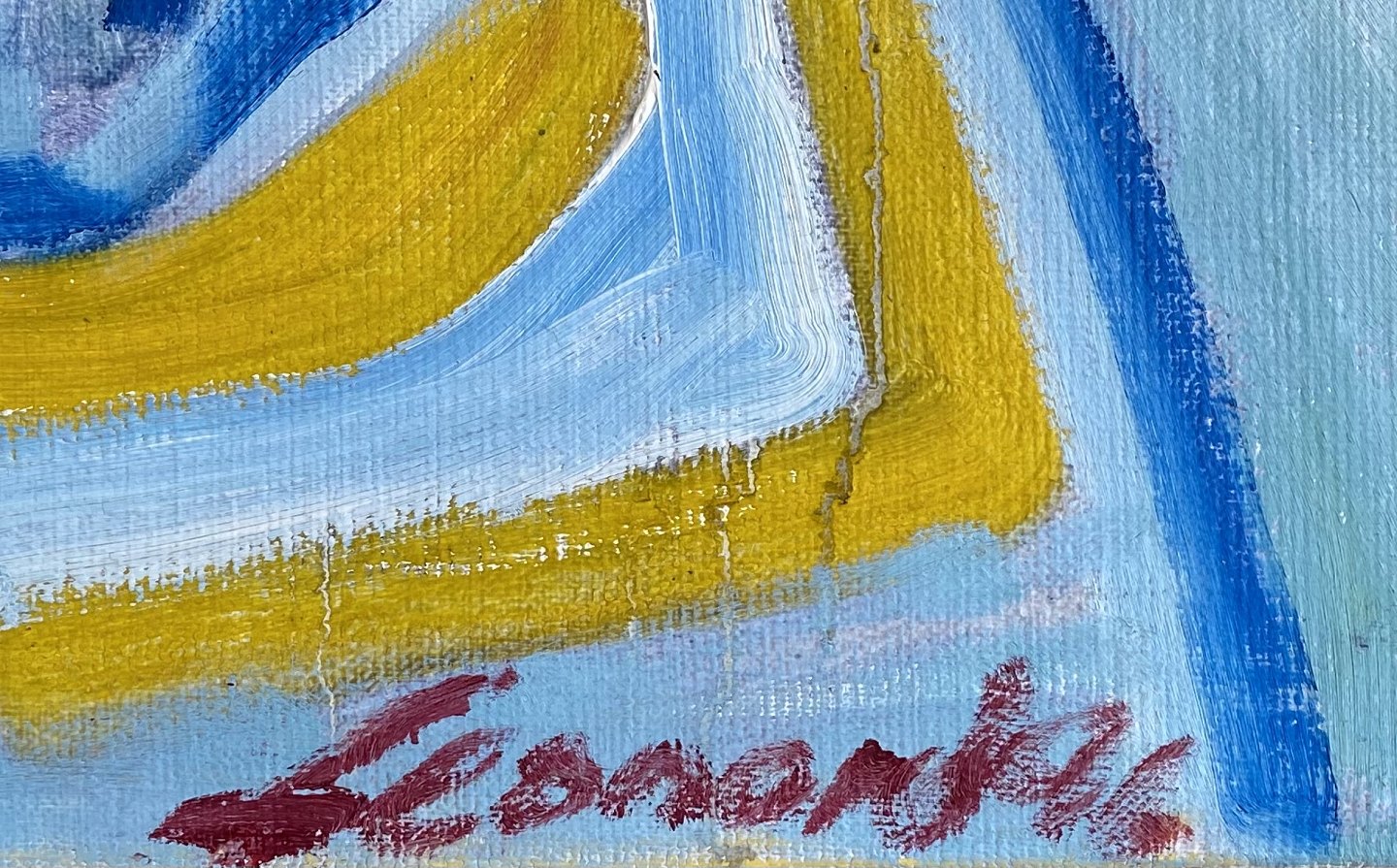 Olie på lærred med motiv med cirkustelt ,ansigter og hest samt fugl i flugt.