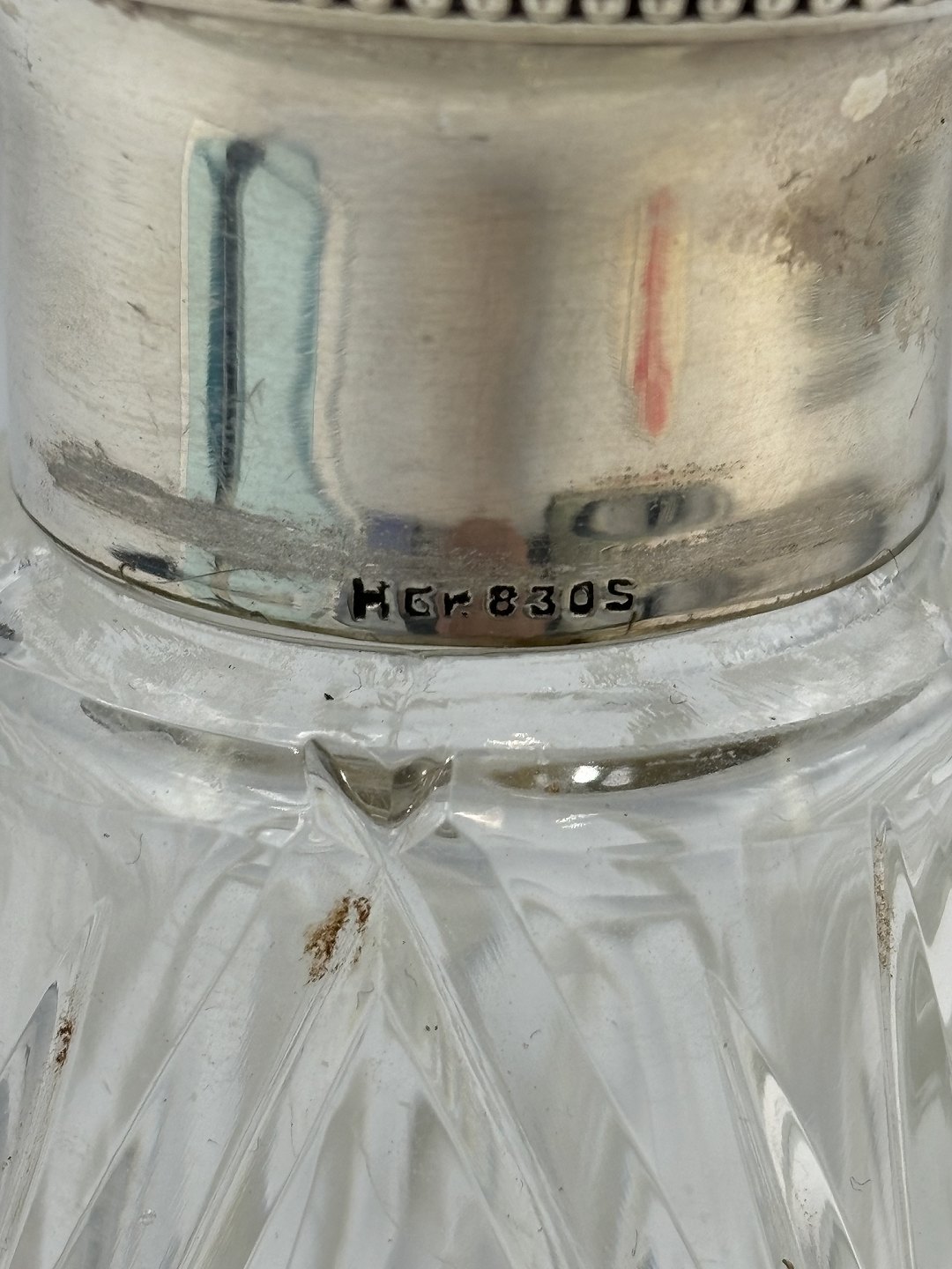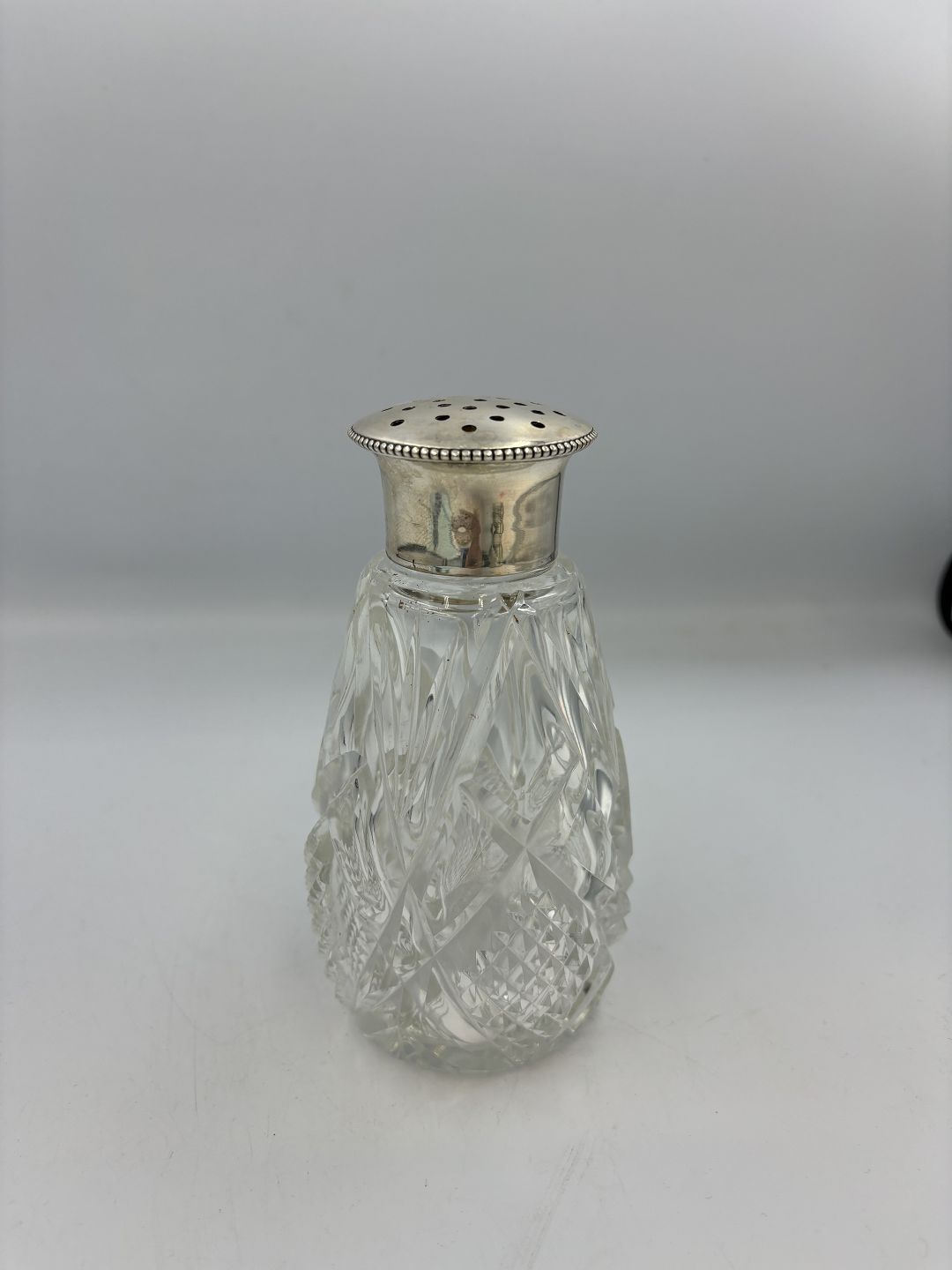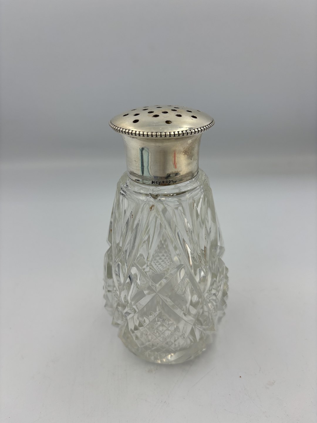 Sølv/Krystal strøbøsse Top er sølv stemplet 830S Underdel er krystal Højde 13 cm