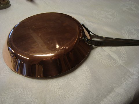 Stor sautepande i kobber D. 25 cm H. 7,5 cm, stegepande D. 27 cm H 4 cm fremstillet af Georg Jensen. I fin Stand. Pris kr. 775 og kr. 375.