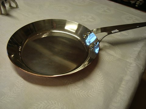 Stor sautepande i kobber D. 25 cm H. 7,5 cm, stegepande D. 27 cm H 4 cm fremstillet af Georg Jensen. I fin Stand. Pris kr. 775 og kr. 375.