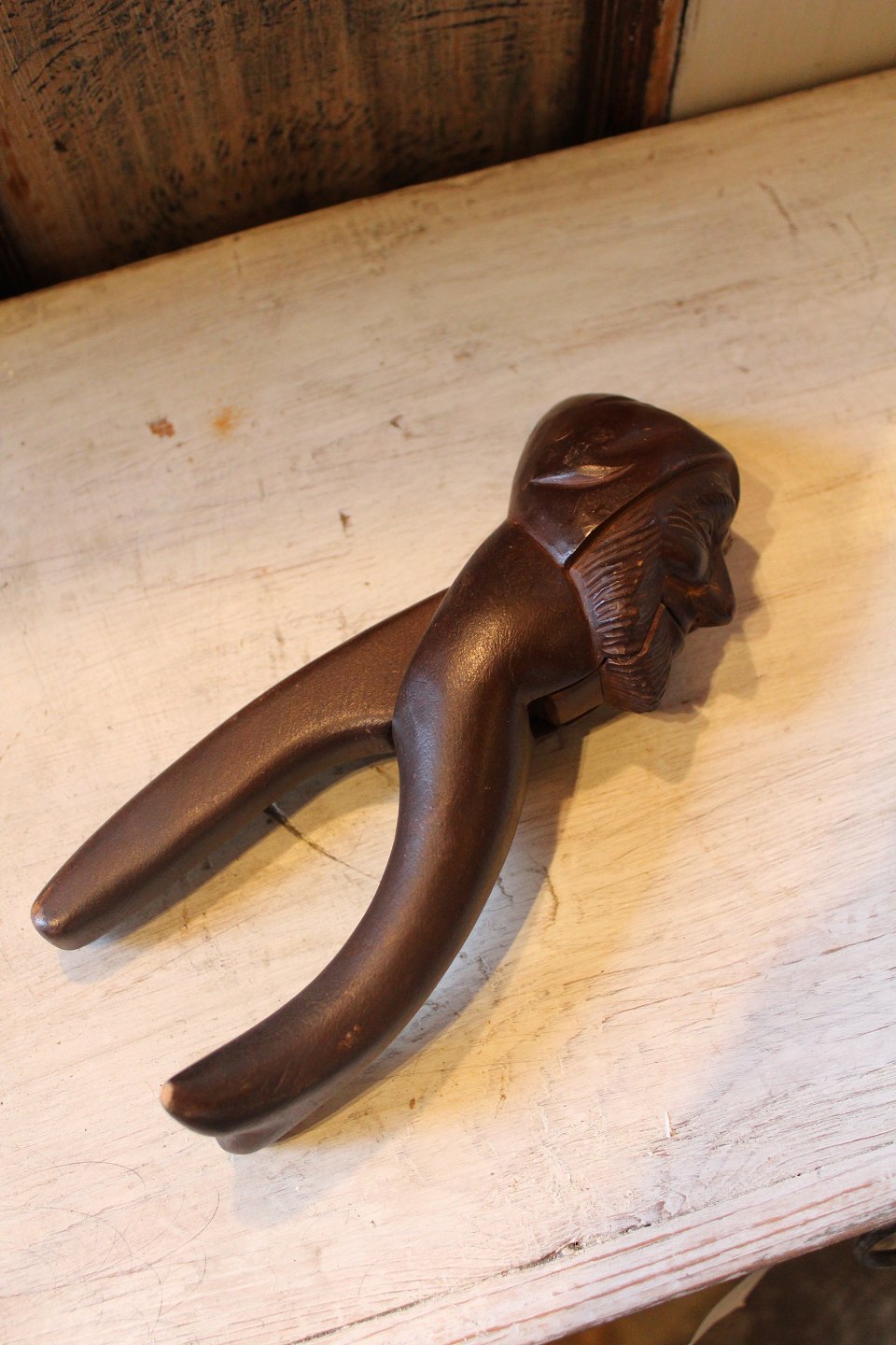 Gammel nøddeknækker i udskåret træ. Nøddeknækkeren er til små nødder som hasselnødder.
