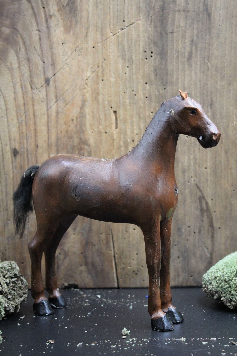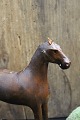 Dekorativ , gammel svensk hest fra omkring år 1900 i udskåret træ med fin bemaling , små læderøre og med en fin patina.