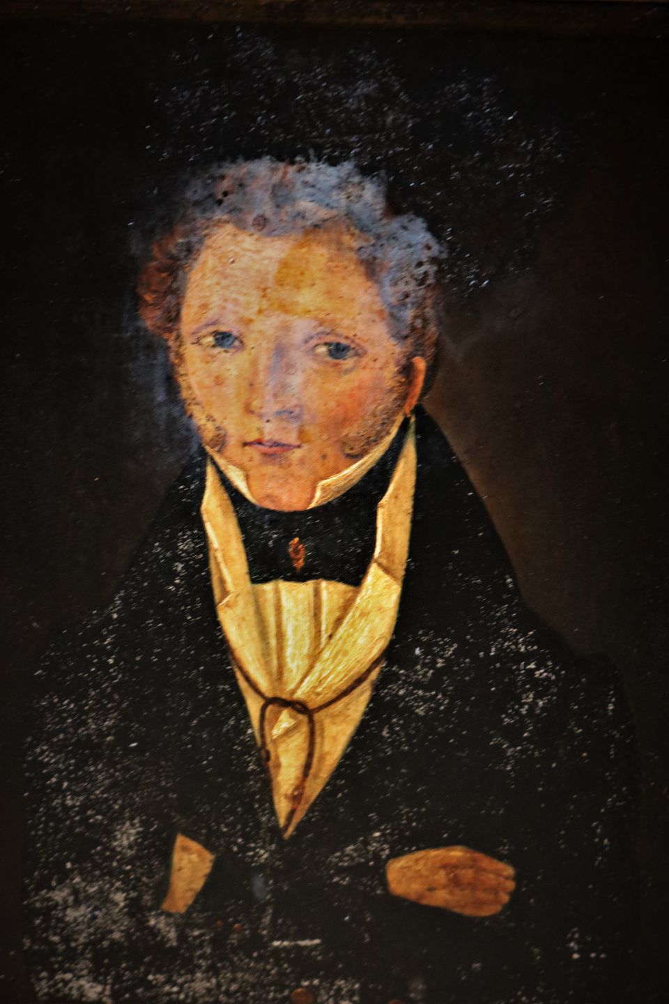 A couple of old 1800 century portrait paintings painted on metal plate in old gold frames.