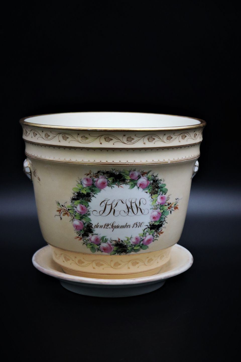 Antik Bing & Grøndahl urtepotteskjuler med underskål med fine blomster dekorationer og landskabsmotiv.