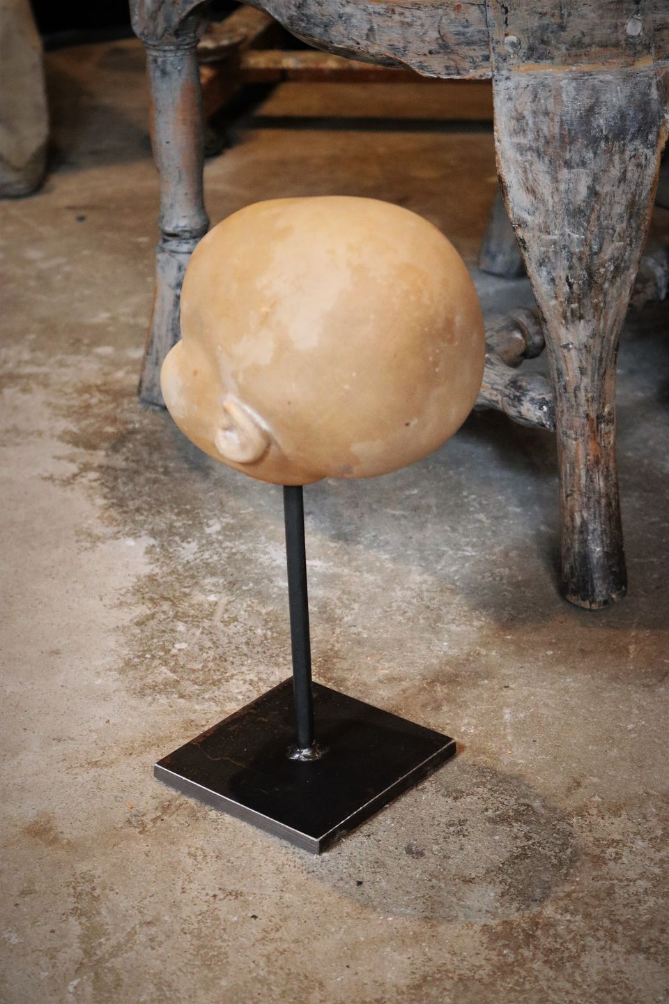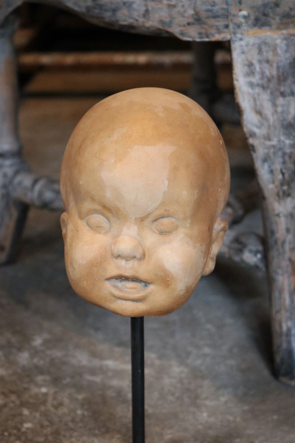 Bust of children's head in terracotta standing on iron foot, part of the figure "Nina on the ball" by Kai Nielsen. H:34cm.