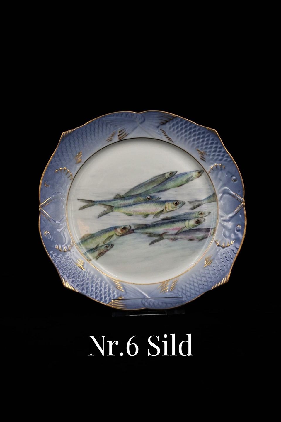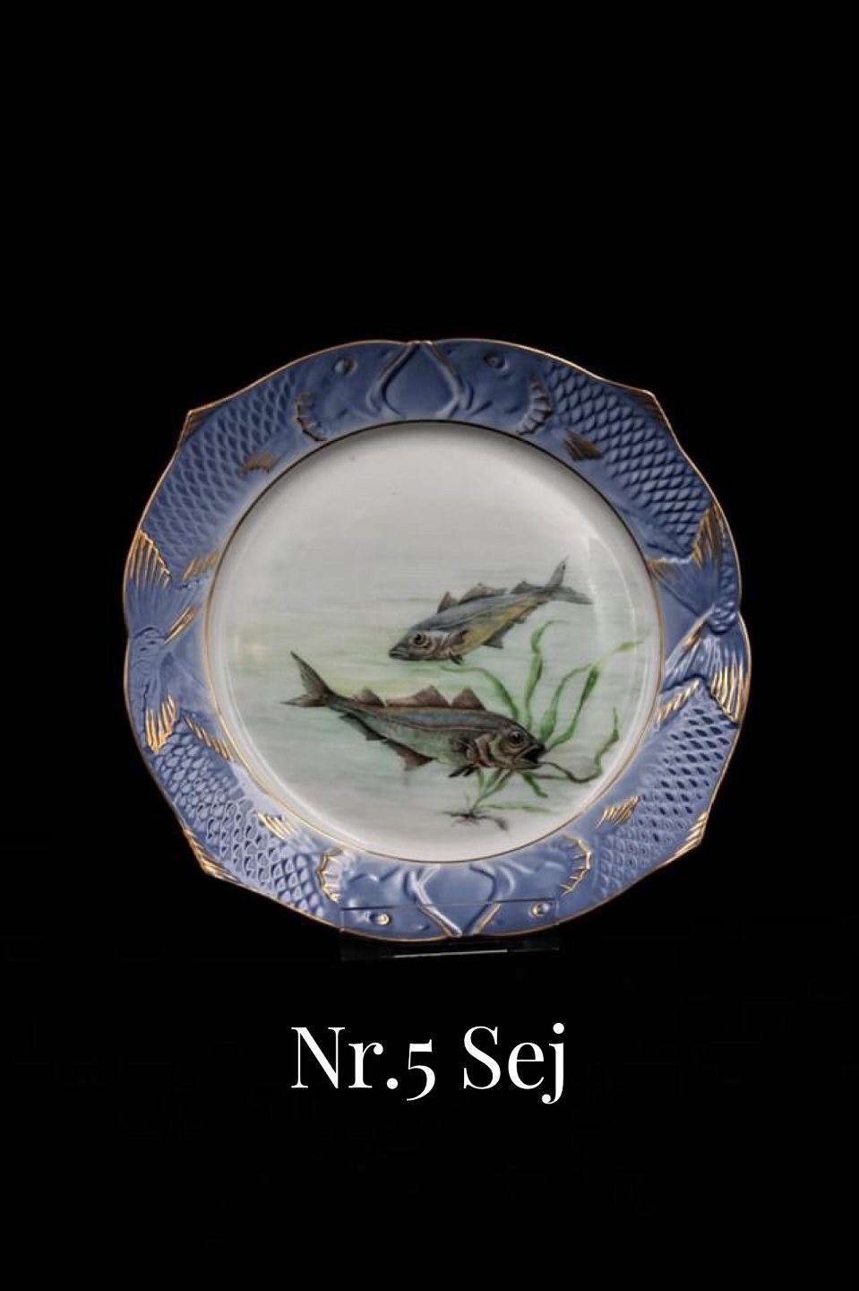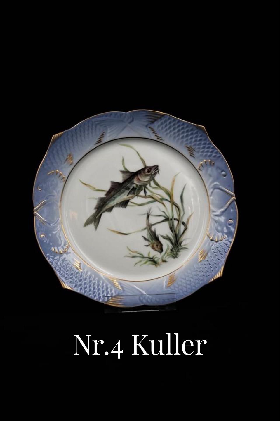 Har blåmalet fiskebort med guldkant og dekorationer og er hver håndmalet (Privatmaler) med hver deres fiske art i 1939 & 1942.