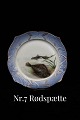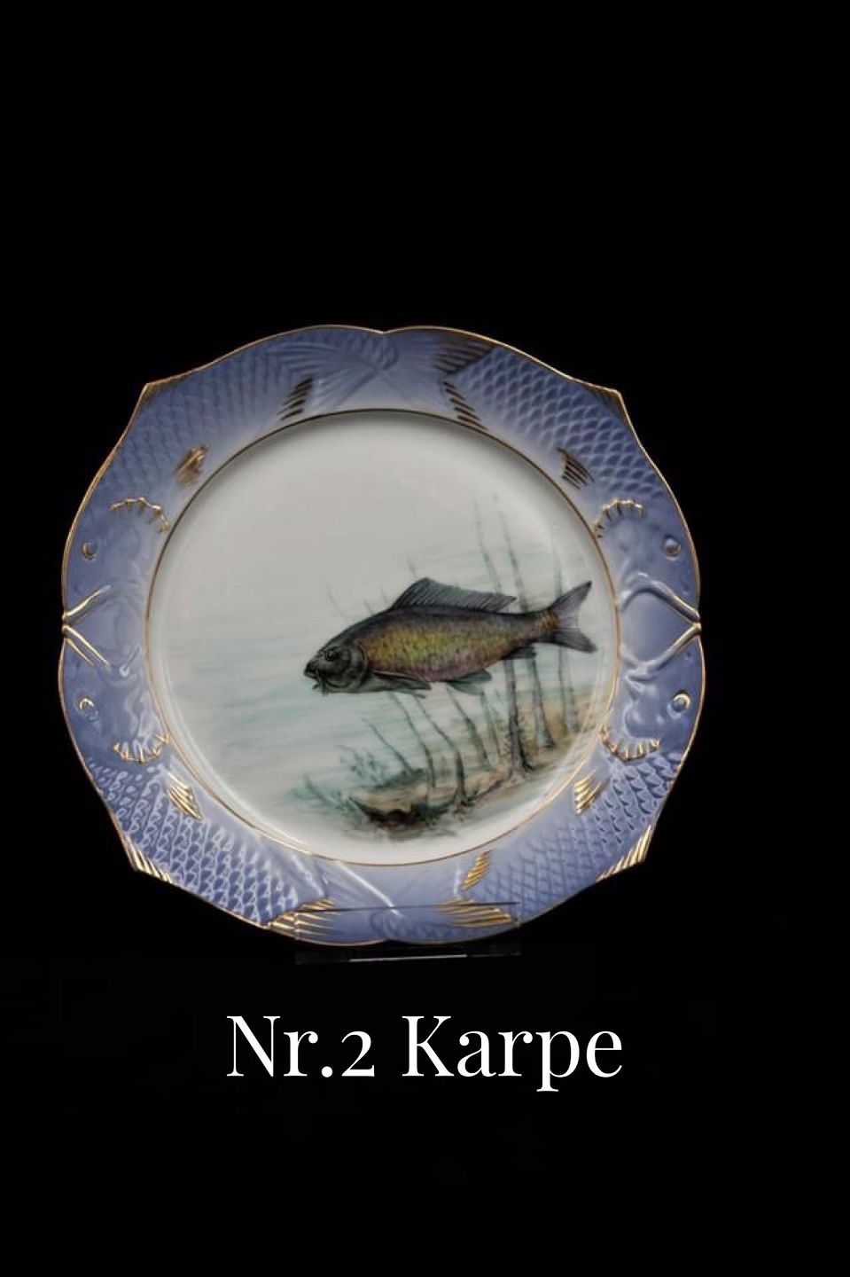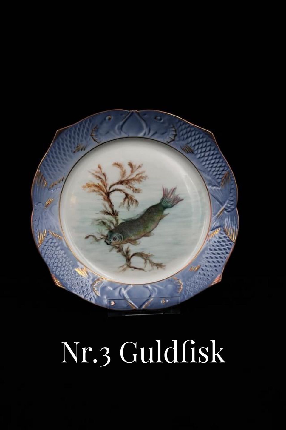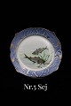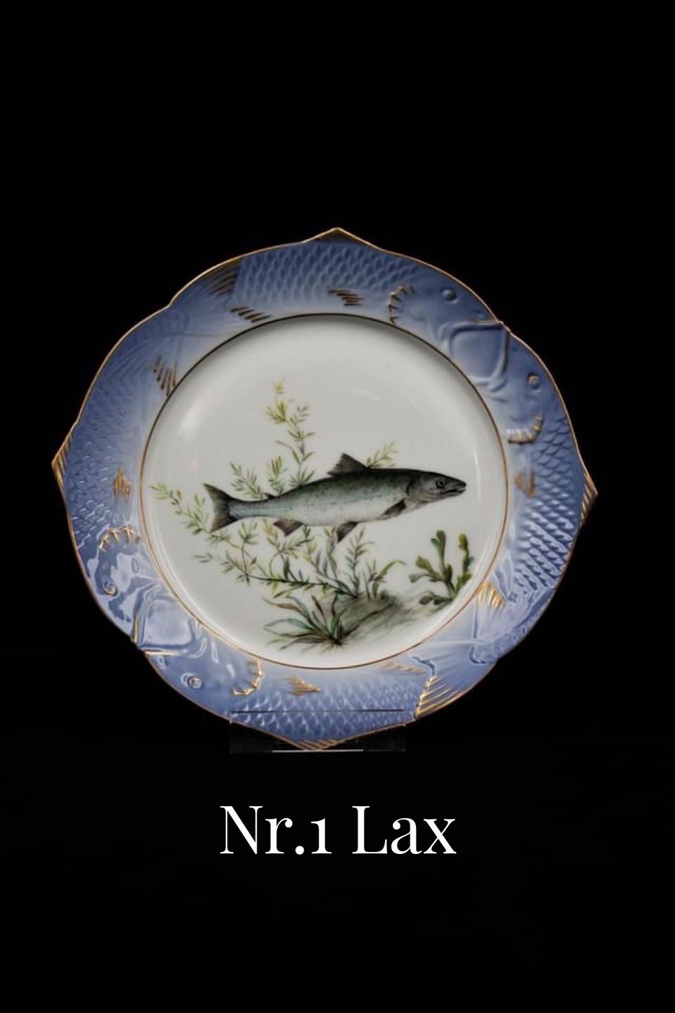 Har blåmalet fiskebort med guldkant og dekorationer og er hver håndmalet (Privatmaler) med hver deres fiske art i 1939 & 1942.