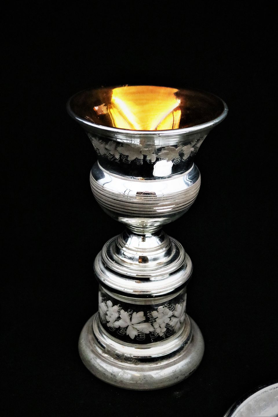 Stor antik , 1800 tals pokal vase på fod i fattigmandssølv dekoreret med bladranke og har en super flot patina. H:31,5cm. Dia.:16cm.