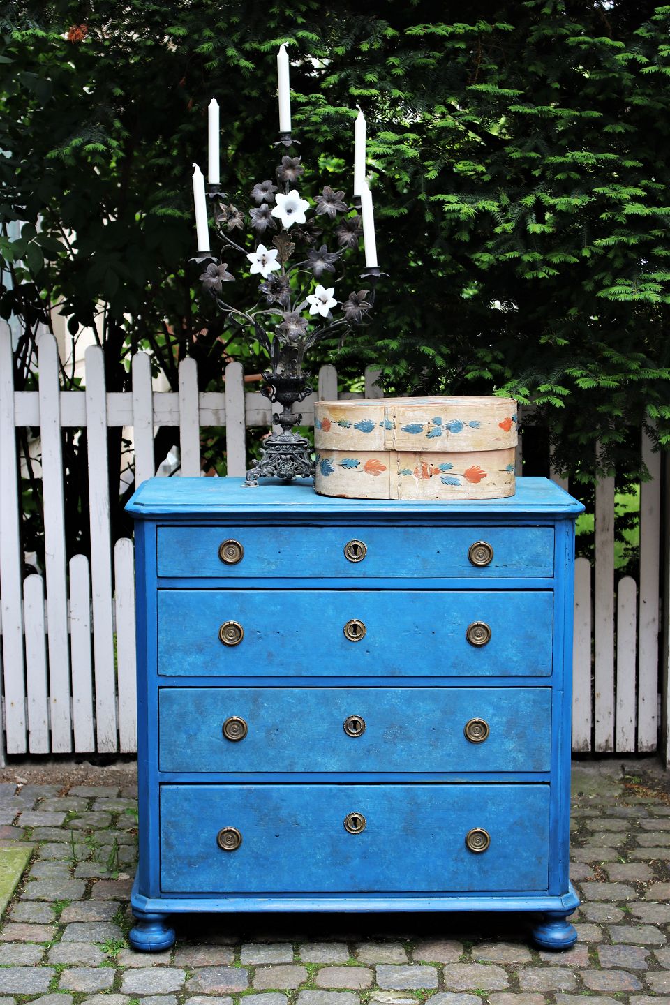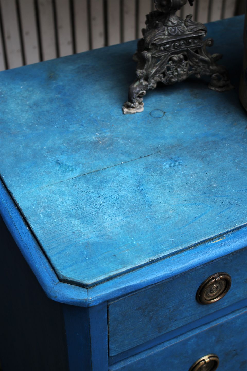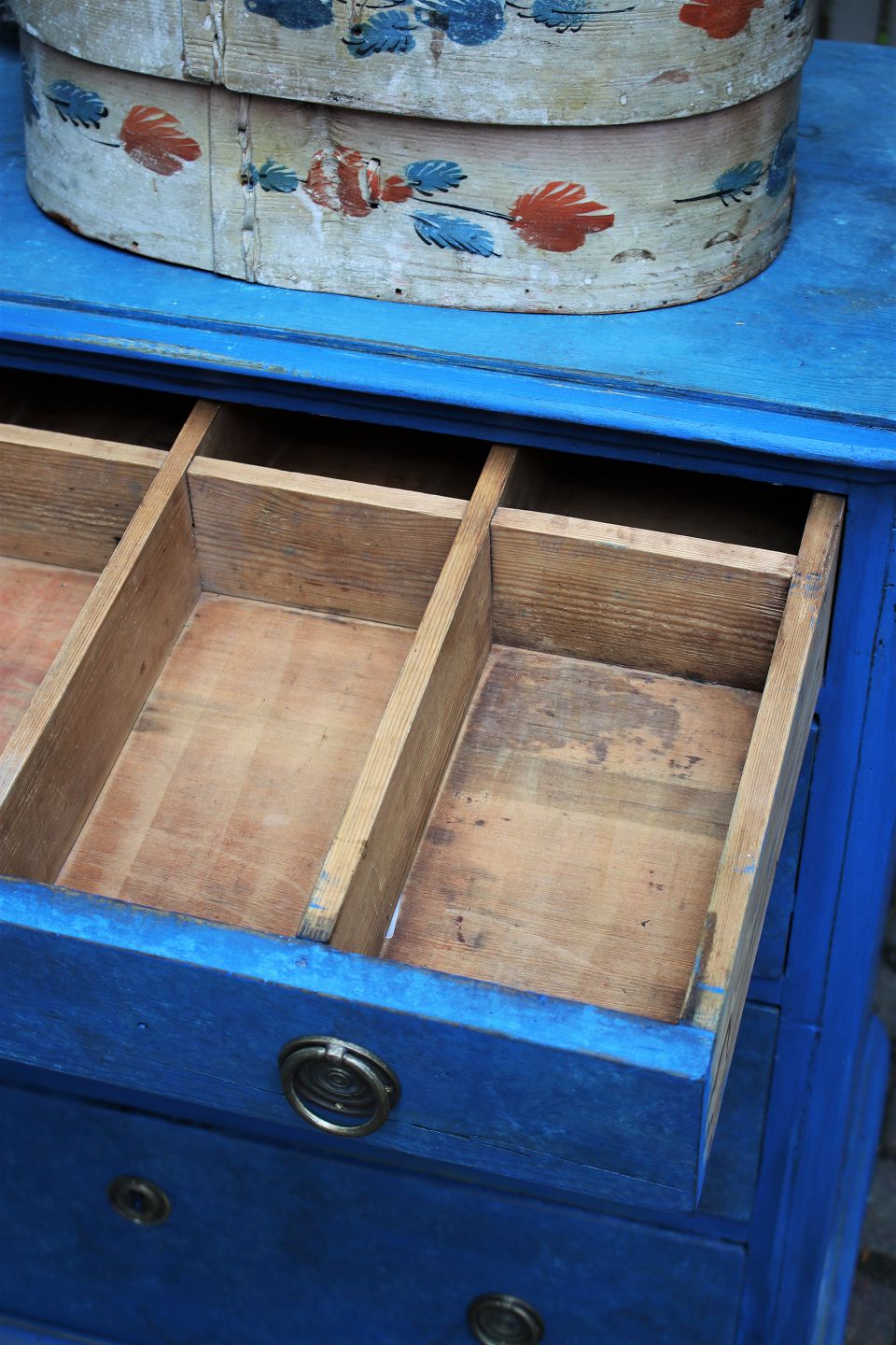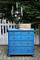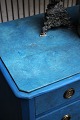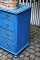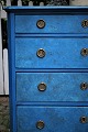 Old chest of drawers with 4 drawers in painted wood with fine blue color, brass fittings and with a fine patina.