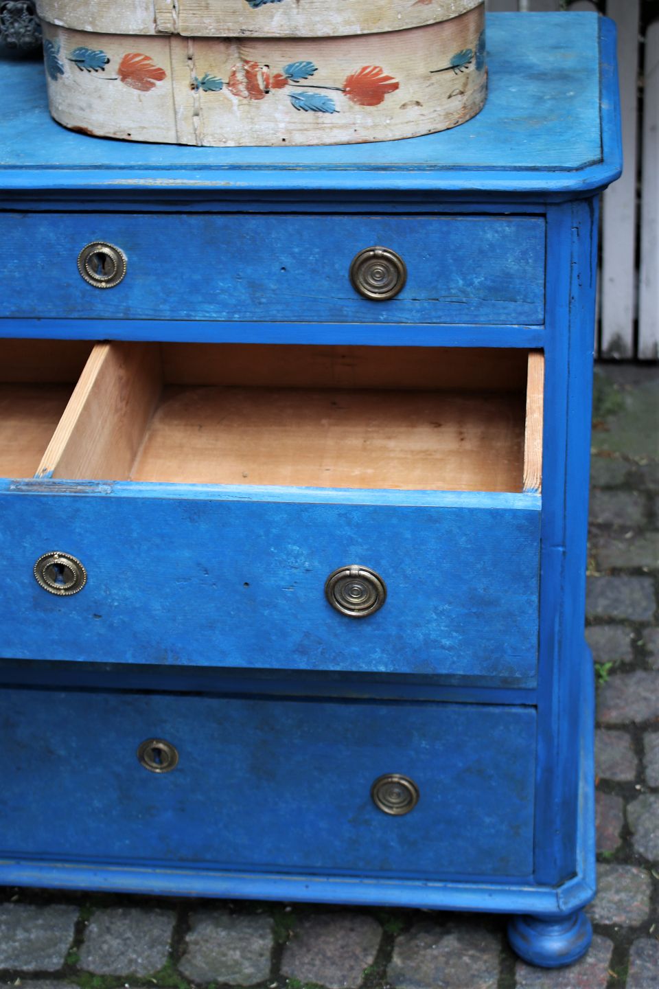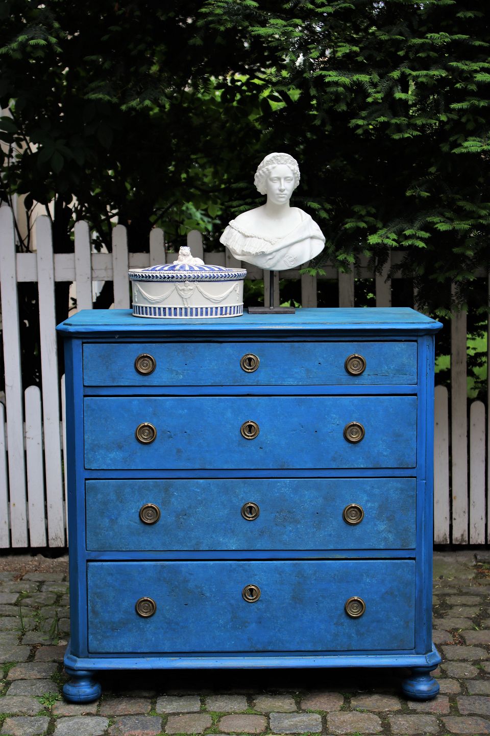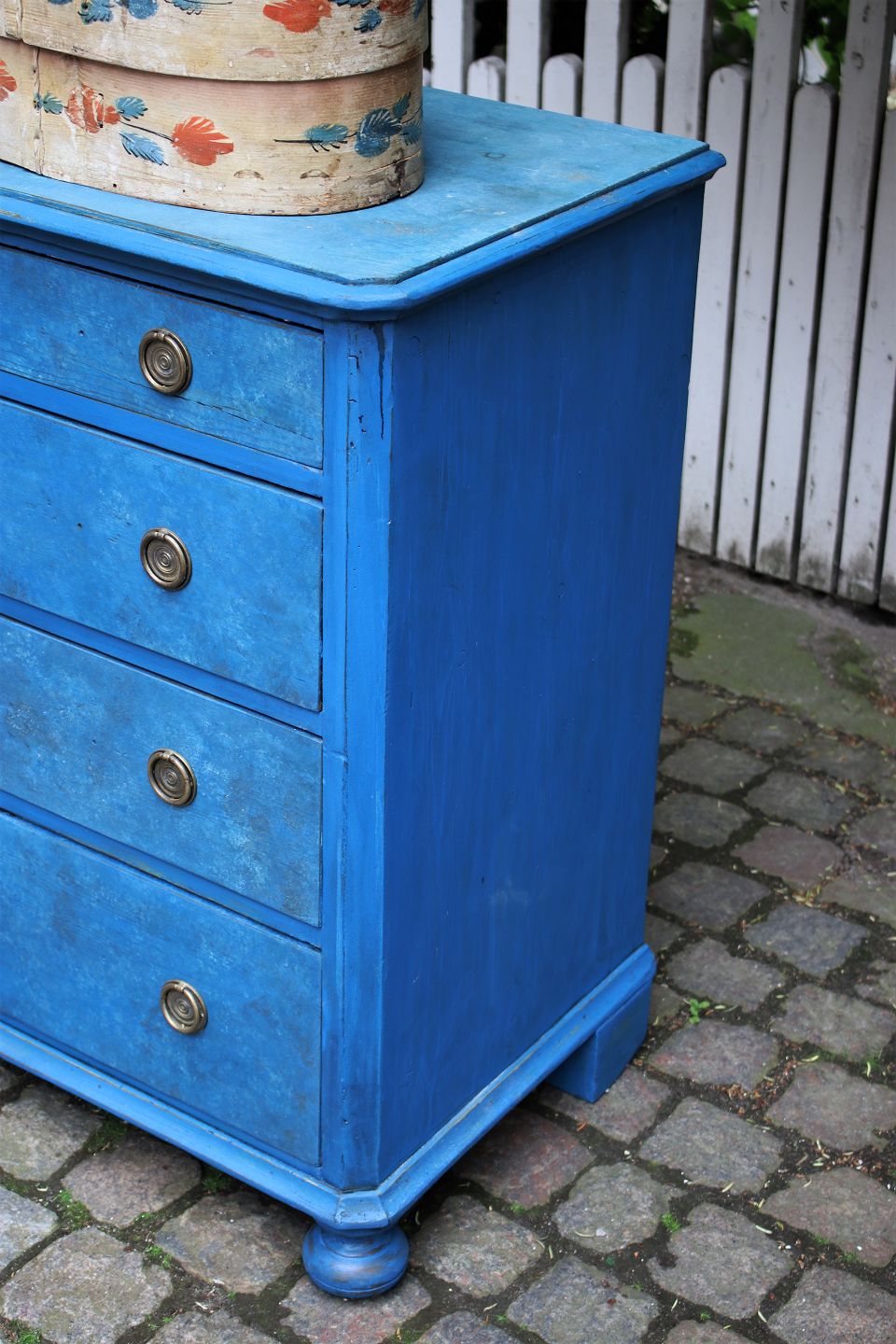 The chest of drawers is from around 1900 and measures: H:93cm. W:93cm. D:49cm.