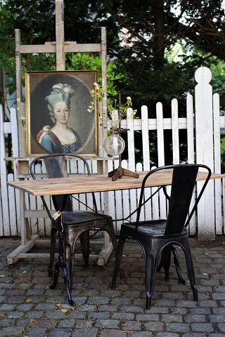 Old French bistro table with black iron base and old wooden top with a fine patina. H:71 cm. L:130cm. W:55cm.